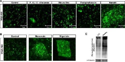 Fig 6. Ionophoric antibiotics narasin inhibits mucus secretion.A. The mucus granules were stained with WGA-Alexa 488 to visualize retained mucus granules. Narasin treated goblet cells (last panel) displayed severe retention of mucus granules. B. Ionophoric antibiotics, Monensin and Nigericin, inhibit mucus secretion similar to narasin. C. Narasin treatment increased intracellular levels of glycosylated protein.