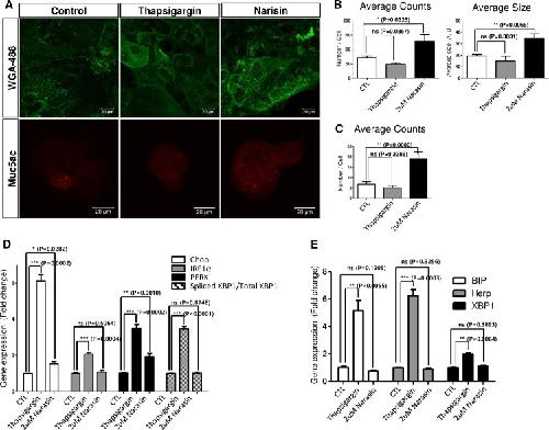 Fig 7. Narasin inhibits mucus secretion in Calu-3 cells.A. Narasin-treated Calu-3 cells were stained with WGA (green) and Muc5ac (Red). Narasin-treated Calu-3 cells accumulated Muc5ac-positive puncta and WGA-stained glycoproteins in the cytosol. B. The number and average size of WGA stained signal was plotted graphically. C. The number of Muc5ac stained puncta was measured and represented graphically. D. Although the PERK level was slightly increased, ER stress was not strongly induced by narasin in Calu-3 cells. Thapsigargin induced strong ER stress response but mucus secretion was not affected. E. Narasin did not severely induce ER stress responses in Xenopus embryos. P-values were calculated from student’s t-test using the triplicate Q-PCR data set. A.U.; Arbitrary unit.