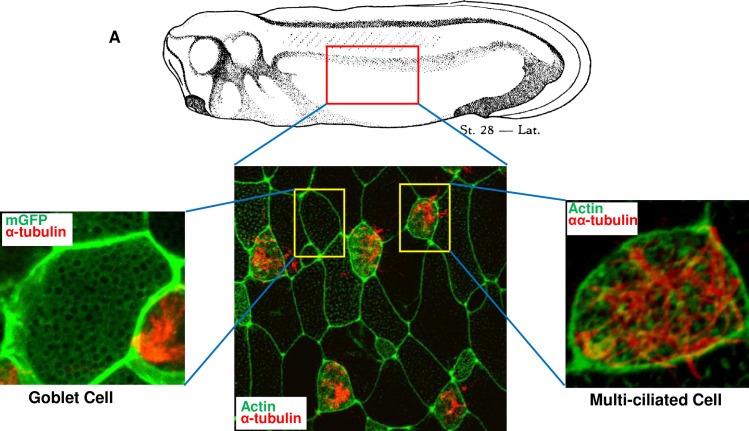 Fig 1. The composition of the muco-ciliary epithelium of Xenopus laevis embryo.A. Immunofluorescence image of mucus secreting goblet cells and multiciliated cells in Xenopus embryonic epidermis. The membrane was stained using membrane GFP (green), Cilia were detected using α-tubulin (red) and actin by anti-actin antibody (green).