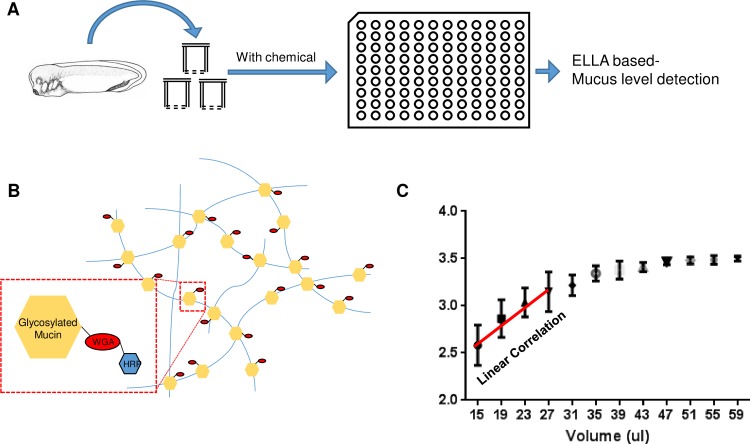 Fig 2. High throughput screening strategy for muco-active reagents from the compounds library using Xenopus embryos.A. Schematic showing the drug screening procedure. Sibling Xenopus embryos were incubated with individual compounds in the library. Then, the media was collected after washing off the compound from the media. The mucus in the media was detected using WGA-HRP and mucus level was analyzed by measuring the optical density (OD) of the HRP substrates. B. Schematic showing the mucus detection procedure using WGA-HRP in ELLA. WGA-HRP can detect the glycosylated region of mucus in the media. C. Dose-dependent linear correlation of OD values with the amount of media used for mucus detection in ELLA.