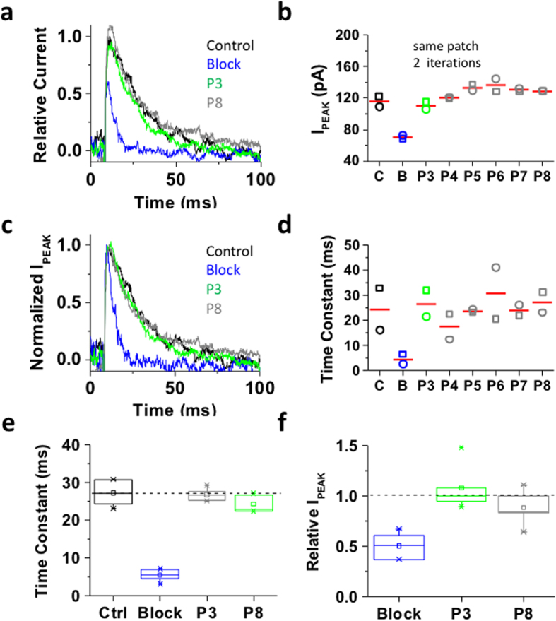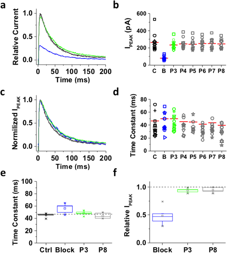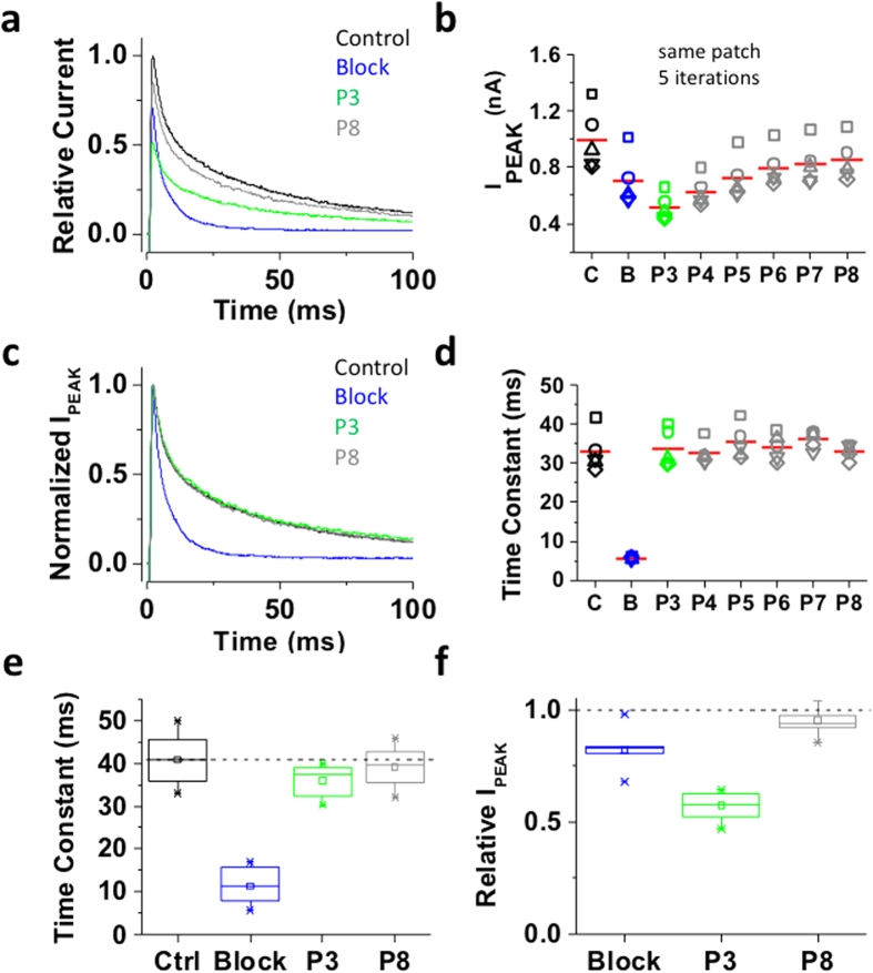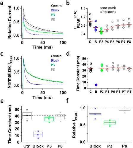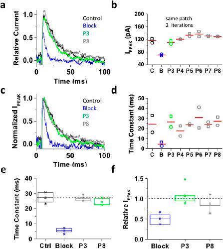 Figure 4. Inactivation of the ternary Kv4.1 channel complex traps internally applied bTBuA.The ternary Kv4.1 channel complex was heterologously expressed in Xenopus oocytes as explained under Methods. This complex includes the accessory subunits KChIP-1 and DPP6. (a) Inside-out macropatch outward currents evoked as described in Figs 2 and 3 legend. (b) Magnitude of peak currents in five consecutive iterations of the pulse protocol. Additional details as described in Fig. 3 legend. (c) Scaled and normalized currents from panel (a). (d) Time constants of decay from the currents evoked by the test pulses as explained in Fig. 3 legend. The reported time constant is the weighted average of the double exponential best-fit time constants. (e) Box plots of the time constants of current decay during blockade by bTBuA (blue box), after washout (green box) and from the currents evoked by P8 (Nâ=â5 patches; 5â40 iterations each). (f) Box plots of the peak current amplitudes during blockade by bTBuA (blue box), after washout (green box) and from the currents evoked by P8 (Nâ=â5 patches; 5â40 iterations each). On average, the peaks of currents evoked by P3 and P8 are significantly different (Kruskal-Wallis, pâ<â1.3âÃâ10â11). |