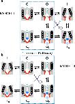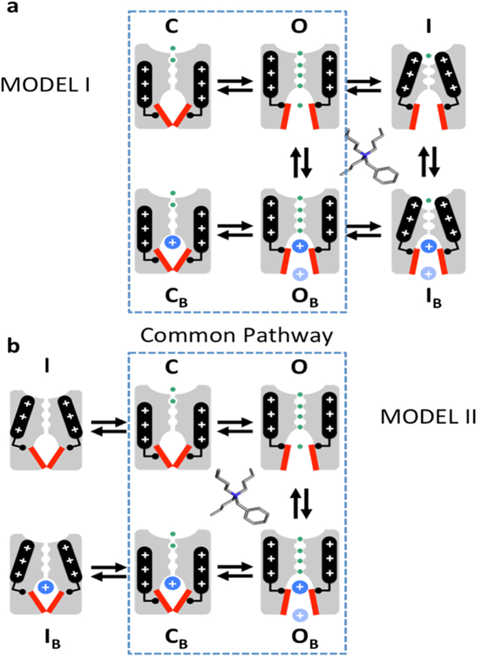 Figure 1. Working models: distinct trap-door scenarios in Shaker and Kv4.1 channels.(a) Cartoon representation of activation and P/C-type inactivation mechanisms in Shaker Kv channels (Model I). For clarity, only two opposing subunits of a Kv channel tetramer are represented in the cartoons. Top and bottom are the extracellular and intracellular sides of the channel, respectively. Voltage sensors (black rod with plus signs) undergo a voltage-dependent conformational change that controls the state of the intracellular activation gate (red bars). S4–S5 linkers (black elbows) interact with the activation gate to transmit the movement of the voltage sensors to the activation gate. Once this gate opens, the Kv channel allows transmembrane K+ flow (green circles) driven by an electrochemical potential. Closing of the activation gate traps the QA ion as shown by Holmgren et al.4. However, inactivation occurs at the external selectivity filter, which does not close the internal activation gate and, therefore, there is no QA ion trapping by inactivation. (b) Cartoon representation of a putative activation-inactivation mechanism in Kv4.1 channels (Model II). Note that closing of the internal gate traps the QA ion. Additionally, disconnecting the voltage sensors from the activation gate inactivates the channel as proposed by Shin et al.37 and maintains the trapped state. The dashed perimeters enclose common pathways in Models I and II. |