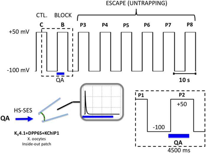 Figure 2. Voltage- and concentration-clamp protocol to probe for QA ion trapping by inactivation.Inside-out macropatches were subjected to eight 5-s depolarizing pulses (P1–P8, −100 to +50 mV) delivered at intervals of 5 s (10-s duty cycle). P1 (C) evokes the control current. P2 (B) evokes the current while the QA ion is applied to the internal side of the inside-out patch using a High Speed Solution Exchange System (HS-SES, Methods). The timing of the application in relation to P2 is shown in the boxed inset. Note that the exposure occurs while the channels undergo activation, opening and inactivation; and that this exposure is terminated 500 ms before the repolarization that closes the channels (once inactivation is complete and at steady-state). This duration is ~20-times longer than the exchange time of the solution switching system (Methods) and, therefore, it is unlikely that QA ions are still present in the intracellular bath solution at the time the channels close by repolarization. Following washout, P3–P8 are then used to test the recovery of the currents. P2, P3 and P4–P8 probe the block, trap and escape stages of the experiment, respectively. To confirm the reproducibility of the results, the P1–P8 sequence and QA ion application were generally repeated as many times as possible until the patch deteriorated. |
