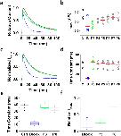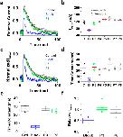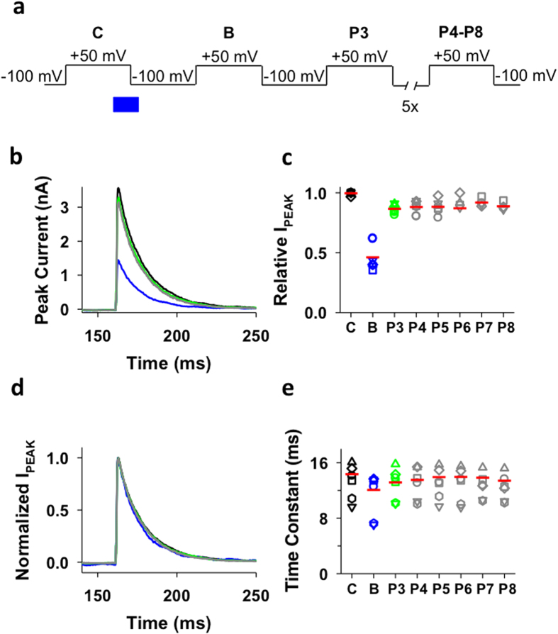 Figure 5. Lengthening the P2–P3 interval does not change block-trap-escape pattern produced by inactivation of the ternary Kv4.1 channel complex.(a) Inside-out macropatch outward currents evoked by a step to +50 mV from a holding voltage of −100 mV. The overlaid traces depict the current profile before (black), during (blue) and after (green and gray) exposure of the intracellular side of the channel to 100 μM bTBuA. The exposure to the QA ion began before the step depolarization and was terminated after macroscopic inactivation reached steady-state (Fig. 2). Note that no exposure was allowed during the repolarizing step that closes the channels. (b) Magnitude of peak currents in four consecutive iterations of the experiment described above. Pulses P1 (C, Control), P2 (B, Block) and P3–P8 evoke the currents as explained in Fig. 2. Critically, the interval between P2 and P3 was prolonged from 5 s (Fig. 4) to 40 s to eliminate the possibility of apparent QA ion trapping resulting from lack of recovery from inactivation at P3. (c) Scaled and normalized currents from panel (a). (d) Time constants of decay from the currents evoked by the test pulses as explained above for panel (a). (e) Box plots of the time constants of current decay during blockade by bTbuA (blue box), after washout (green box) and from the currents evoked by P8 (N = 5 patches; 4–12 iterations each). (f) Box plots of the relative peak current amplitudes during blockade by bTbuA (blue box), after washout (green box) and from the currents evoked by P8 (N = 5 patches; 4–12 iterations each). On average, the peaks of currents evoked by P3 and P8 are significantly different (Kruskal-Wallis, p < 0.001). |