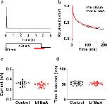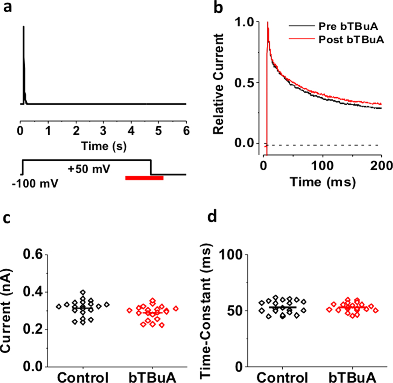 Figure 7. Inactivation of the ternary Kv4.1 channel complex prevents internal access of bTBuA to the pore.(a) Schematic of experimental protocol. Current was evoked by a 5-s step depolarization from −100 to +50 mV to ensure complete steady-state inactivation. The intracellular side of the patch was exposed to 100 μM intracellular bTBuA for a total of 1.5 s (red bar). The application began once current inactivation had reached steady-state, and continued for 1 s at +50 mV. The exposure to bTBuA was then terminated 500 ms after repolarizing the membrane to −100 mV. To test whether bTBuA had any effect, the same pulse was subsequently repeated while the inside patch was bathed in control intracellular solution. (b) Overlay of macropatch currents before (black) and after (red) intracellular exposure to bTBuA. (c) Comparison of peak currents before (control) and after (bTBuA) exposure (20 iterations of the pulse sequence on the same macropatch). (d) Comparison of weighted time constant of decay from currents before (control) and after (bTBuA) exposure (same experiment, 20 iterations). Horizontal lines in (c,d) indicate mean values. |