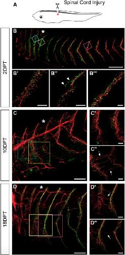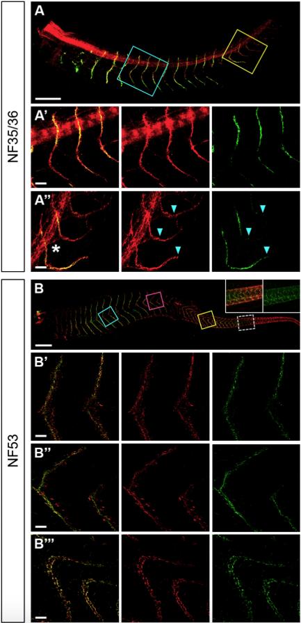 The frog neuromuscular junction (NMJ) has been extensively used as a model system to dissect the mechanisms involved in synapse formation, maturation, maintenance, regeneration, and function. Early NMJ synaptogenesis relies on a combination of cell-autonomous and interdependent pre/postsynaptic communication processes. Due to their transparency, comparatively easy manipulation, and remarkable regenerative abilities, frog tadpoles constitute an excellent model to study NMJ formation and regeneration. Here, we aimed to contribute new aspects on the characterization of the ontogeny of NMJ formation in Xenopus embryos and to explore the morphological changes occurring at the NMJ after spinal cord injury. Following analyses of X. tropicalis tadpoles during development we found that the early pathfinding of rostral motor axons is likely helped by previously formed postsynaptic specializations, whereas NMJ formation in recently differentiated ventral muscles in caudal segments seems to rely on presynaptic inputs. After spinal cord injury of X. laevis tadpoles our results suggest that rostral motor axon projections help caudal NMJ re-innervation before spinal cord connectivity is repaired.