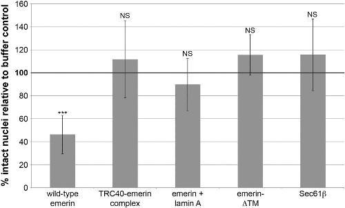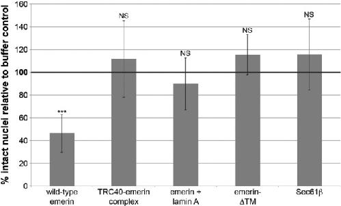 FIGURE 3:. Rescue of nuclear breakage. Experiments and quantification were performed as in Figure 1. Data are plotted as the mean and SD from multiple independent experiments. The wild-type emerin data are the same as presented in Figure 1C (n = 8 extracts). TRC40-emerin was added at 5 nM (n = 6 extracts). For the âemerin + lamin A experiment,â recombinant lamin A was added during nuclear assembly at 1 nM before the addition of 5 nM emerin (n = 5 extracts). The emerin-ÎTM protein (deletion of transmembrane domain amino acids 228â242) was added at 5 nM (n = 4 extracts). The Sec61β protein was added at 5 nM (n = 2 extracts), and 50 nM Sec61β also did not induce nuclear breakage (unpublished data). Across all experiments, the average number of intact nuclei for buffer controls was 240. Statistical analysis was performed relative to the buffer control, which was normalized to 100% intact nuclei (bold horizontal line). ***p < 0.005; NS, not significant. |