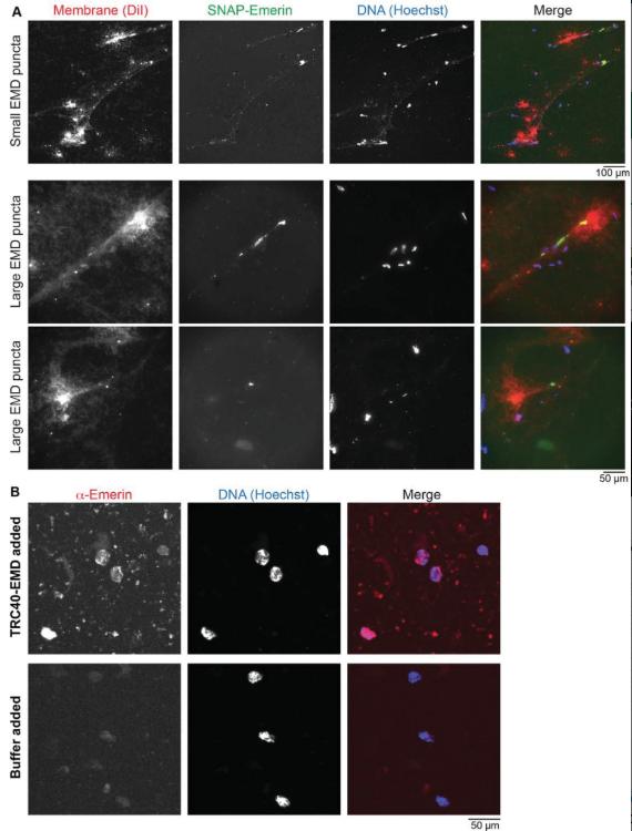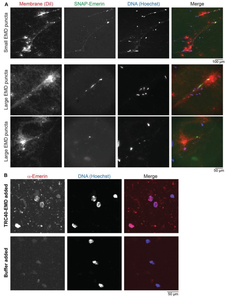 FIGURE 2:. TRC40 rescues emerinâs nuclear localization. (A) Experiments were performed as in Figure 1, except that the extract was supplemented with 1 µM DiI and 0.4 µM SNAP-emerin conjugated to Alexa Fluor 488. Representative images of small and large emerin puncta are shown. (B) Nuclei assembled in X. laevis egg extract as shown in Figure 1 were supplemented with 8 nM TRC40-EMD or an equivalent volume of dialysis buffer. After a 30-min incubation, nuclei were fixed, spun down onto coverslips, and stained with an anti-emerin antibody and Hoechst. Emerin images were acquired with the same exposure time. Representative images are shown. |
