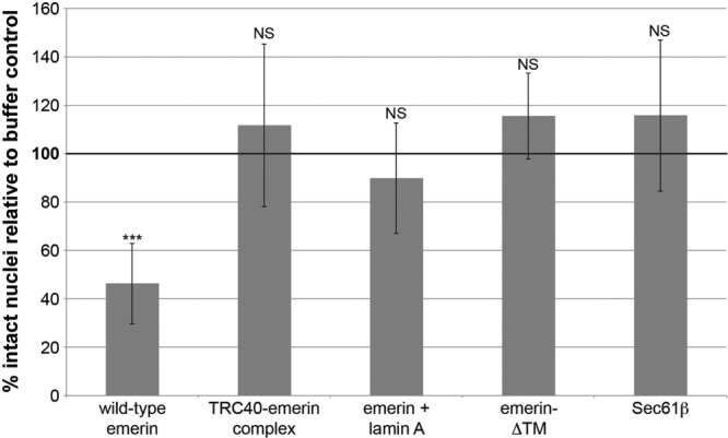 FIGURE 3: Rescue of nuclear breakage. Experiments and quantification were performed as in Figure 1. Data are plotted as the mean and SD from multiple independent experiments. The wild-type emerin data are the same as presented in Figure 1C (n = 8 extracts). TRC40-emerin was added at 5 nM (n = 6 extracts). For the âemerin + lamin A experiment,â recombinant lamin A was added during nuclear assembly at 1 nM before the addition of 5 nM emerin (n = 5 extracts). The emerin-ÎTM protein (deletion of transmembrane domain amino acids 228â242) was added at 5 nM (n = 4 extracts). The Sec61β protein was added at 5 nM (n = 2 extracts), and 50 nM Sec61β also did not induce nuclear breakage (unpublished data). Across all experiments, the average number of intact nuclei for buffer controls was 240. Statistical analysis was performed relative to the buffer control, which was normalized to 100% intact nuclei (bold horizontal line). ***p < 0.005; NS, not significant. |