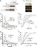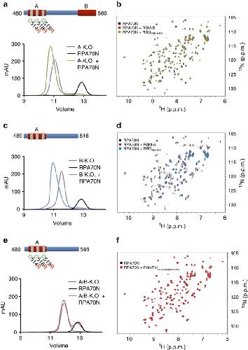 Figure 3. RPA70N dynamically interacts with both RBM-A and RBM-B.(a) Mutation of RBM-A does not abolish binding of PrimPol's RBD to RPA70N. Chromatographs showing the retention volumes of RBDA-KO (purple), RPA70N (black) and RBDA-KO with RPA70N in a 1:1 ratio (green). (b) 15N-1H HSQC spectra showing RPA70N alone (black), in the presence of twofold molar excess of either RBDA-KO (green) or RBM-B peptide (residues 542–560) (red). The perturbations observed for RBDA-KO are similar to those induced by the RBM-B peptide. (c) Truncation of RBM-B does not prevent binding of PrimPol's RBD to RPA70N. Chromatographs showing the retention volumes of RBDB-KO (purple), RPA70N (black) and RBDB-KO with RPA70N in a 1:1 ratio (blue). (d) 15N-1H HSQC spectra showing RPA70N alone (black) or in the presence of twofold molar excess of RBDB-KO (blue) or RBM-A peptide (residues 510–528) (red). The perturbations observed for RBDB-KO are similar to those induced by the RBM-A peptide. (e) Mutation of both RBM-A and RBM-B abolishes the binding of PrimPol's RBD to RPA70N. Chromatographs showing the retention volumes of RBDA/B-KO (purple), RPA70N (black) and RBDA/B-KO with RPA70N in a 1:1 ratio (red). (f) 15N-1H HSQC spectra showing RPA70N alone (black) or in the presence of twofold molar excess of RBDA/B-KO (red). The near identity of the two spectra indicates there is no interaction. |