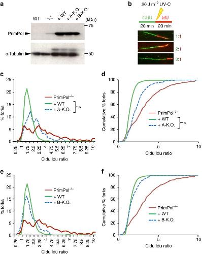 Figure 5. RBM-A is required for PrimPol function in DNA replication restart.(a) PrimPolâ/â DT40 cells were complemented with un-tagged human PrimPol constructs; wild-type hPrimPol (+ WT), hPrimPolD519R/F522A (+ A-KO) and hPrimPolD551R/I554A (+ B-KO). âWT' indicates lysate from wild-type DT40 cells, ââ/ââ indicates lysate from PrimPolâ/â DT40 cells. (b) DNA fibre analysis was performed on DT40 cells expressing each PrimPol construct. Cells were ultraviolet-C irradiated (20âJâmâ2) between the CldU and IdU labelling periods (each 20âmin). Representative DNA fibres showing 1:1, 2:1 and 3:1 CldU:IdU ratios are presented; >100 individual DNA fibres were scored for each experiment. (c) Mutation of RBM-A causes increased fork stalling following ultraviolet-C irradiation. Data are representative of the means of three individual experiments and were subject to an unpaired t-test showing a significant difference between the mean CldU/IdU ratio for the â+ WT hPrimPol' and â+ A-KO hPrimPol' data sets (P<0.05). (d) DNA fibre analysis from the â+ A-KO hPrimPol' DT40 cells presented as a cumulative percentage of forks at each ratio. (e) Mutation of RBM-B does not significantly alter the level of fork stalling following ultraviolet-C irradiation. DNA fibre analysis of the â+ B-KO hPrimPol' DT40 cells, showing the percentage of forks at each CldU:IdU ratio. Data are representative of the means of three individual experiments. (f) DNA fibre analysis from the â+ B-KO hPrimPol' DT40 cells presented as a cumulative percentage of forks at each ratio. |