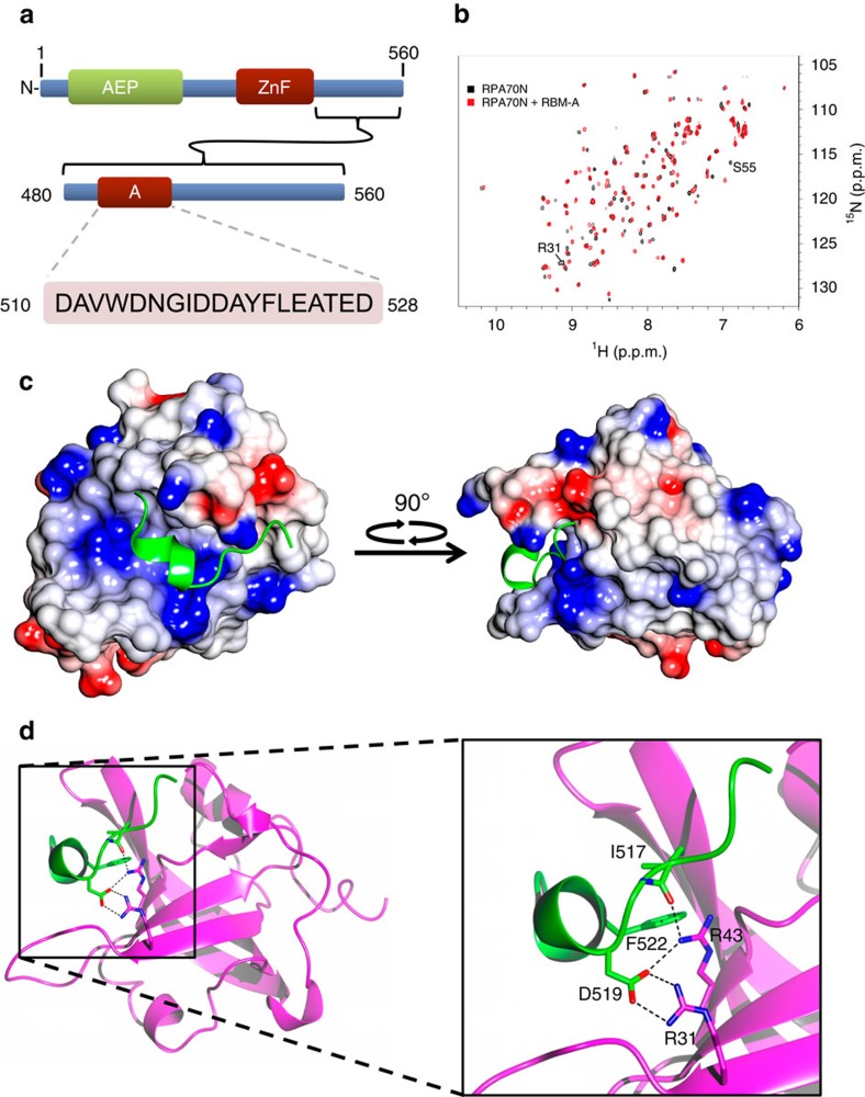 Figure 1. PrimPol possesses a conserved RBM that binds to the basic cleft of RPA70N.(a) Schematic showing the sequence of PrimPol's RBM-A (residues 510â528), located in the C-terminal RBD (residues 480â560). (b) 15N-1H HSQC spectra showing RPA70N in the absence (black) or presence (red) of twofold molar excess of unlabelled RBM-A peptide. (c) Electrostatic surface model of RPA70N with RBM-A (green) bound in the basic cleft. Basic and acidic surfaces are coloured blue and red, respectively. (d) Key stabilizing interactions of RBM-A (green) in the RPA70N basic cleft (purple). RBM-A binds between β sheets in the β barrel of RPA70N. Of particular importance for binding are the electrostatic interactions of D519 with the side chains of two arginines (R31 and R43) in the RPA70N basic cleft. |