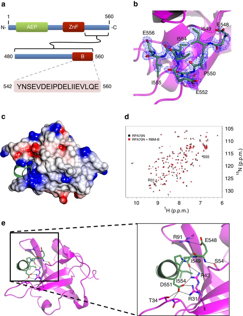 Figure 2. PrimPol possesses a second RBM that also binds to the basic cleft of RPA70N.(a) The sequence of PrimPol's RBM-B (residues 542â560), located in the C-terminal RBD (residues 480â560). (b) The continuous electron density of RBM-B residues 548â556 in the complex with RPA70N. (c) Electrostatic surface model of RPA70N with RBM-B (green) bound in the basic cleft. Basic and acidic surfaces are coloured blue and red, respectively. (d) 15N-1H HSQC spectra showing RPA70N in the absence (black) or presence (red) of a twofold molar excess of unlabelled RBM-B peptide. (e) Key stabilizing interactions of RBM-B (green) in the RPA70N basic cleft (purple). RBM-B binds between β sheets in the β barrel of RPA70N. D551 is of particular importance as it forms a number of electrostatic interactions with both the side chains and a backbone amide NH of the RPA70N peptide. |