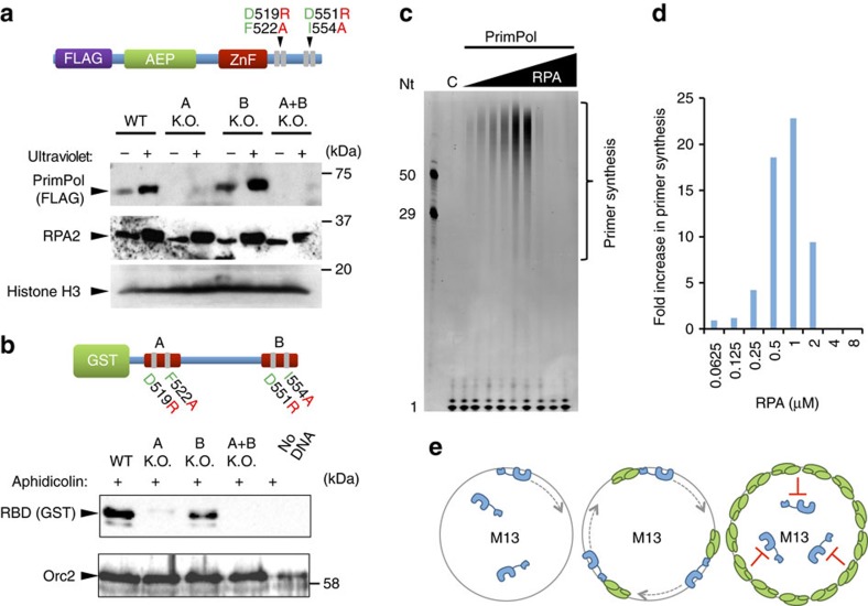Figure 6. RPA recruits PrimPol to stalled replication forks in vivo.(a) PrimPol's RBM-A, but not RBM-B, is critical for recruitment to chromatin. Flp-In T-Rex-293 cells transfected with WT and RBM-A and B mutant PrimPol constructs were either mock (â) or ultraviolet-C (30âJâmâ2) (+) irradiated before separation into Triton X-100 (0.5%) soluble and insoluble fractions. Samples were analysed by western blot alongside whole-cell extracts. Only insoluble samples are presented here, whole-cell extracts and soluble blots can be found in Supplementary Fig. 6. (b) PrimPol's RBD is recruited to Xenopus egg extract chromatin in response to aphidicolin treatment, RBM-A is critical for this recruitment. Recombinant hPrimPol GST constructs (4ângâμlâ1) were added to Xenopus egg extract supplemented with sperm nuclei (3 à 103âμlâ1). Extract was treated with aphidicolin 100âμgâmlâ1 and incubated at 21â°C for 80âmin. Chromatin was isolated and associated proteins analysed by SDSâPAGE and western blotting using the antibodies indicated. (c) Low concentrations of RPA stimulate PrimPol's primase activity, high concentrations inhibit. Primer synthesis by WT hPrimPol (400ânM) on M13 ssDNA templates (20ângâμlâ1) in the presence of increasing concentrations of RPA. âC' indicates the no enzyme control, oligonucleotide (Nt) length markers are shown on the left of the gel. (d) Quantification of data shown in âc'. For each RPA concentration the fold increase in primer synthesis relative to reactions containing no RPA was calculated. Data are representative of three repeat experiments. (e) Schematic showing the effect of increasing RPA concentrations on PrimPol's primase activity. When no RPA is present a proportion of PrimPol binds to the M13 template and facilitates primer synthesis (left). When low/moderate concentrations of RPA are present PrimPol is recruited to the RPA/ssDNA interface causing an increase in primer synthesis activity (middle). At high RPA concentrations the M13 DNA template is fully saturated, blocking access of PrimPol to the DNA and inhibiting primer synthesis (right). |