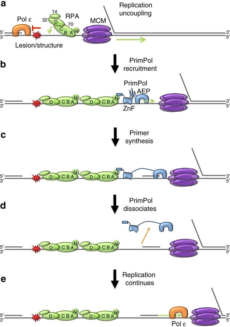 Figure 7. Model for PrimPol recruitment to stalled replication forks by RPA.(a) Unrepaired DNA damage lesions, or DNA secondary structures, in the leading strand template lead to stalling of polymerase É. This causes uncoupling of replication, generating ssDNA downstream of the DNA damage lesion/structure and facilitating binding of RPA. Note that for simplicity other replisome components and lagging strand synthesis machinery are not shown. (b) PrimPol is recruited to the ssDNA interface uncovered by the replicative helicase through the interaction of its RBM-A with RPA70N. This interaction is stabilized by the binding of the ZnF and AEP domains to ssDNA. (c) PrimPol catalyses the synthesis of a new DNA primer, before further extension is prevented by the restraining effect of the RPA interaction and ZnF domain, coupled with the enzyme's low processivity. (d) Unable to continue with primer extension, PrimPol dissociates from the template strand. Re-binding upstream is prevented by RPA. (e) The nascent primer is utilized by the replicative polymerase for continued DNA replication. This leaves behind a short RPA-coated ssDNA region opposite the lesion to be filled in by template switching or TLS. |
