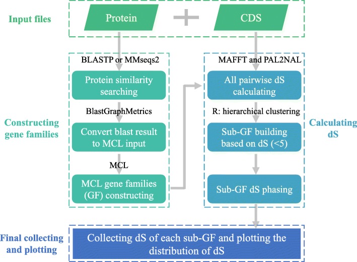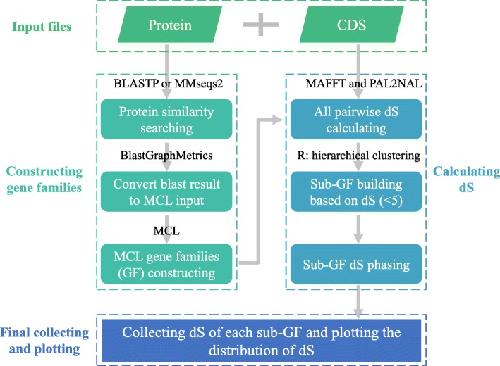 Fig. 1. Workflow in WGDdetector. The input files only including the protein and CDS files. The proteins were used in the similarity searching and gene family constructing. The CDSs were used to calculating dS values based on the proteins constructed gene family information. The further sub-gene family building and dS phasing were implemented with the Perl scripts and the R software