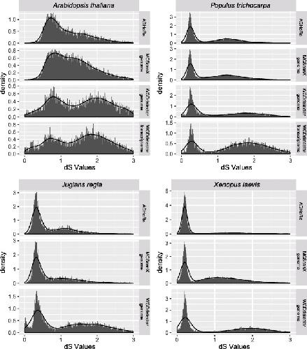 Fig. 2. Comparison of the dS distributions within A. thaliana and P. trichocarpa. The y axis is the density values and the x axis represent the dS values. The four species were marked at the top of each sub picture. The software and corresponding dataset were listed at the right of each sub picture