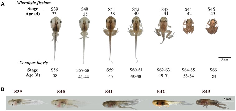 Thyroid hormone (T3) is essential for vertebrate development, especially during the so-called postembryonic development, a period around birth in mammals when plasma T3 level peaks and many organs mature into their adult form. Compared to embryogenesis, postembryonic development is poorly studied in mammals largely because of the difficulty to manipulate the uterus-enclosed embryos and neonates. Amphibian metamorphosis is independent of maternal influence and can be easily manipulated for molecular and genetic studies, making it a valuable model to study postembryonic development in vertebrates. Studies on amphibian metamorphosis have been largely focused on the two highly related species Xenopus laevis and Xenopus tropicalis. However, adult X. laevis and X. tropicalis animals remain aquatic. This makes important to study metamorphosis in a species in which postmetamorphic frogs live on land. In this regard, the anuran Microhyla fissipes represents an alternative model for developmental and genetic studies. Here we have made use of the advances in sequencing technologies to investigate the gene expression profiles underlying the tail resorption program during metamorphosis in M. fissipes. We first used single molecule real-time sequencing to obtain 67, 939 expressed transcripts in M. fissipes. We next identified 4,555 differentially expressed transcripts during tail resorption by using Illumina sequencing on RNA samples from tails at different metamorphic stages. Bioinformatics analyses revealed that 11 up-regulated KEGG (Kyoto Encyclopedia of Genes and Genomes) pathways and 88 Gene Ontology (GO) terms as well as 21 down-regulated KEGG pathways and 499 GO terms were associated with tail resorption. Our findings suggest that tail resorption in M. fissipes and X. laevis shares many programs. Future investigations on function and regulation of these genes and pathways should help to reveal the mechanisms governing amphibian tail resorption and adaptive evolution from aquatic to terrestrial life. Furthermore, analysis of the M. fissipes model, especially, on the changes in other organs associated with the transition from aquatic to terrestrial living, should help to reveal important mechanistic insights governing mammalian postembryonic developments.