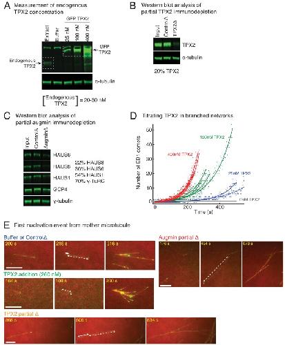 Figure 3—figure supplement 1. Controls for varying TPX2 and augmin concentration in Xenopus egg extracts.(A) Endogenous TPX2 concentration was measured using quantitative, fluorescence western blot. A series of known concentrations of recombinant GFP-TPX2 were compared with endogenous TPX2 and probed via anti-TPX2 antibody. The endogenous concentration was estimated as 20–30 nM in Xenopus egg extracts. α-tubulin was used as loading control. The experiment was repeated thrice, including different truncations of recombinant TPX2 used for the gradient. (B) Partial depletion of TPX2 from Xenopus egg extracts was assessed using quantitative, fluorescence western blot. Untreated extract (input), IgG-depleted (control) and TPX2 depleted extracts were compared and probed via anti-TPX2 antibody. α-tubulin was used as loading control. The experiment was repeated more than thrice with independent extract preparations. (C) Partial depletion of augmin from Xenopus egg extracts was assessed using quantitative, fluorescence western blot. Untreated extract (input), IgG-depleted (control) and augmin-depleted extracts were compared and probed for HAUS1, HAUS6 and HAUS8 subunits of augmin complex. Components of γ-TuRC (γ-tubulin and GCP4) were also assessed. Protein levels in augmin depletion compared to control depletion: HAUS8 (20%), HAUS6 (36%), HAUS1 (54%), γ-tubulin and GCP4 (70% each). The experiment was repeated more than thrice with independent extract preparations. (D) Branching nucleation was observed as a function of TPX2 concentration in Xenopus egg extracts. Endogenous TPX2 was depleted and recombinant GFP-TPX2 was added back at specified concentrations in the presence of 10 μM RanQ69L. Branched The number of EB1 comets observed in individual branched networks is plotted over time. Number of branched networks analyzed: 25 nM (n = 2), 100 nM (n = 4), and 400 nM TPX2 (n = 6). The measurement was used to estimate the concentration of TPX2 for addition experiments (Figure 3A), and repeated twice with independent extract preparations. (E) Position of first branching event on a naked mother MT was recorded during the formation of individual branched MT networks. Example measurement for buffer or control depletion, addition of 260 nM TPX2, partial depletion of TPX2 (20% of control), or partial depletion of augmin (20% of control) are displayed. For all networks, second displayed frame shows emergence of an EB1 comet on the naked mother. Distance from the mother’s minus-end is denoted by solid line segment, and from mother’s plus-end by dashed line segment. The fractional distance from mother’s minus-end was measured as solid segment length divided by sum of solid and dashed segment lengths. These measurements were made for multiple branched networks and plotted in Figure 3B. Scale bars, 10 μm. |
