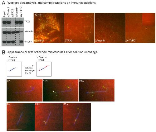 Figure 4—figure supplement 1. Control immunodepletion reactions and measurement of length of initial branched microtubules.(A) Augmin, TPX2 or γ-TuRC were immunodepleted from Xenopus egg extracts, and western blot analysis against TPX2, γ-tubulin or HAUS1 (augmin subunit) was performed to verify depletion. Branching MT nucleation assay was performed by addition of 10 μM RanQ69L. Representative images at 12 min of the reaction show loss of branching MT nucleation upon augmin or TPX2 immunodepletion, and severe reduction in overall level of nucleation upon γ-TuRC immunodepletion. Low level of γ-TuRCs remain in egg extracts upon immunodepletion with anti-XenC antibody, resulting in rare MTs shown in inset. Scale bar, 10 μm. This analysis was repeated twice with independent egg extract preparations, and the same extracts were used for experiments shown in Figure 4A–C. (B) De novo MTs (blue) were generated by performing branching reaction in Xenopus egg extracts where no augmin is present. Non MT-bound, soluble proteins were removed with buffer wash. The reaction was observed while exchanging the solution to egg extracts containing augmin but no TPX2 at time t = 0 s. Branched MTs (red, denoted with white arrows) and their plus-ends labelled with EB1-mCherry (pseudo-colored as green), nucleated within 10–30 s from de novo MTs (blue) MT, and roughly at the same time as the elongating plus-end (yellow arrows). Scale bar, 10 μm. The experiment was repeated twice with independent egg extract preparations. |