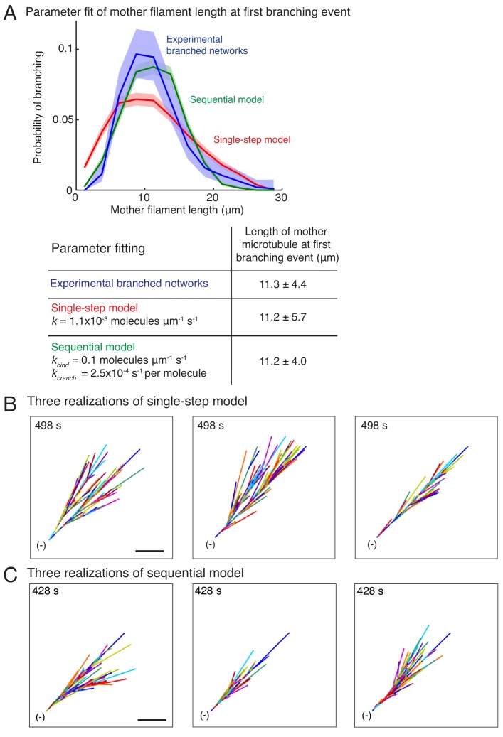 Figure 1—figure supplement 3. Stochastic models of branched microtubule networks.(A) Distribution of mother MT lengths at the first branching event, used for parameter estimation of the single-step model and the sequential model, is displayed. The fit parameters are tabulated below. Number of measurements: n = 381 experimental measurements, and n = 4000 measurements for each model. (B–C) Three stochastic simulations of (B) the single-step model, and (C) the sequential model are displayed using parameters in (A). Individual MTs are labelled in rotating color scheme. Scale bar, 10 μm. See Figure 1, Videos 3 and 4. |