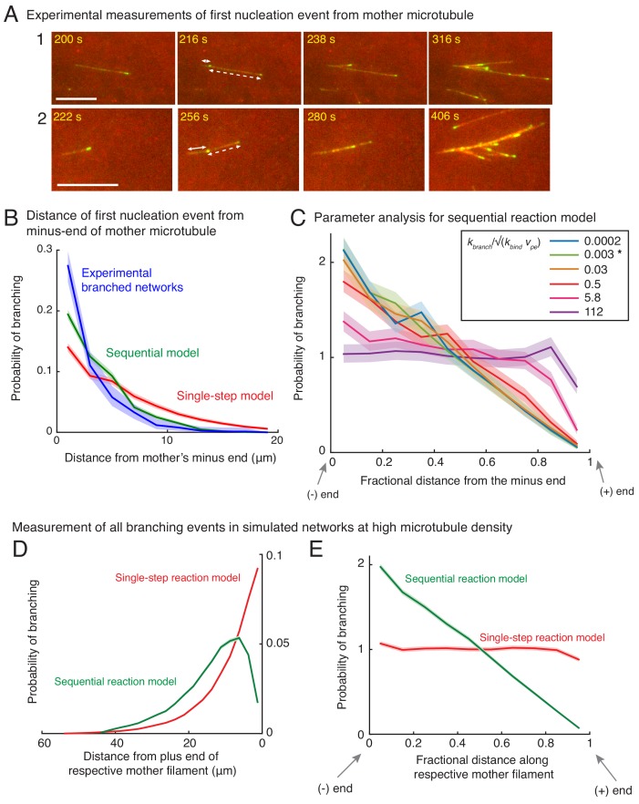 Figure 2. Nucleation profile of first branching event and spatial organization of microtubules in dense branched networks.Spatial location of first branching event on a naked mother MT was recorded during the formation of individual branched MT networks, and the following distributions were measured. See Figure 2—figure supplement 1A for representative examples. (A) Distance of the nucleation site from the mother’s plus-end was measured at the time point when first branching event occurred. Rightmost (0 μm) point on the horizontal axis denotes nucleation near the mother’s plus-end. Inverted x-axis is plotted for consistency with (B). (B) Fractional distance was obtained by dividing the branching nucleation site from the mother’s minus-end by the total length of the mother MT when the first branching event occurred. Leftmost (0) point on x-axis denotes nucleation near the mother’s minus-end, while rightmost (1) represents nucleation near the mother’s plus-end. For panels (A-B), normalized probability of branching was plotted for n = 381 experimental measurements (blue), and n = 4000 each using the single-step model (red) or the sequential model (green). Shaded regions depict the 95% bootstrap confidence intervals. The experiments and analyses were performed with three independent extract preparations and all data was pooled. See also Figure 2—figure supplement 1. Spatial organization of MTs in dense branched networks. (C) Positions of minus-ends were obtained in simulated branched networks. The distances of all minus-ends were calculated from the origin (seed MT’s minus-end, panel (F)), then normalized by seed MT’s length (set to 1). The resulting probability distribution of was plotted. Data was pooled for 10–60 MTs in roughly 250 branched networks each simulated using the single-step model (red, n = 633517) and sequential model (green, n = 495794). Shaded regions depict the 95% bootstrap confidence intervals. (D) Positions of MT plus-ends were obtained in branched networks. Distances of all plus-ends were calculated from the origin (see panel (F)), normalized by the largest distance (set to 1), and the resulting probability distribution was plotted. For experimental measurements, data was pooled from 27 branched networks, each containing 10–55 EB1 comets, generated in two independent extract preparations (blue, n = 47362). For simulated networks, data was pooled from 10 to 60 MTs in 250 branched networks each simulated using the single-step model (red, n = 633517) and sequential model (green, n = 495794). Shaded regions depict the 95% bootstrap confidence intervals. See Figure 2—figure supplement 2B for the measurement procedure. (E) Tubulin intensity in branched networks was plotted against distance from the origin, normalized by the longest distance (set to 1). For experimental data, measurements were pooled for 33 branched networks (blue) observed in one Xenopus extract preparation, and analysis was repeated with three independent extract preparations. For simulations, data was pooled for 20–50 MTs in approximately 250 branched networks simulated using the single-step model (red) or the sequential model (green). Shaded regions depict the standard deviation in intensity measurements. See Figure 2—figure supplement 2A for the measurement procedure. (F) Schematic representation of MT organization in branched networks generated via the single-step model (top) or the sequential model (bottom). While the total number of MTs and their lengths is the same in the two representations, the overall distribution of plus-ends, minus-ends and MT mass is more concentrated near the origin (yellow) in the sequential model. See also Figure 2—figure supplement 3.Figure 2—figure supplement 1. Measurement of nucleation profile and testing robustness of sequential model.(A) Position of first branching event on a naked mother MT was recorded during the formation of individual branched networks. Two branched networks were selected in the field of view and time-lapse is displayed. Time points at 216 s and 256 s respectively show the first branching event on the naked mother marked by emergence of an EB1 comet. Growth of this new MT is displayed at times 238 s and 280 s respectively for the two networks. The position measurements were made when the EB1 comet first emerged (216 s and 256 s respectively). Distance from the mother’s minus-end is denoted by a solid line segment, and from mother’s plus-end by a dashed line segment. The fractional distance was measured dividing the solid segment length by the sum of solid and dashed segment lengths. These measurements were made for n = 381 branched networks and are plotted in (B) and Figure 2A–B. Scale bars, 10 μm. (B) Spatial location of first branching event on a naked mother MT was recorded during the formation of individual branched MT networks. The distance of the branching nucleation site from the mother’s minus-end was measured, and compared with single-step and sequential models as in Figure 2A–B. Leftmost (0 μm) point on x-axis denotes nucleation near the mother’s minus-end. Normalized probability was plotted for n = 381 experimental measurements (blue), and n = 4000 each using the single-step model (red) or the sequential model (green). Shaded regions depict the 95% bootstrap confidence intervals. The experiments and analyses were performed with three independent extract preparations and all data was pooled. (C) Robustness of sequential model was tested by varying the dimensionless ratio of the branching rate, kbranch (units: sec−1), and effective binding rate constant, √(kbind vpe) (units: sec−1). The fractional position of the first nucleation event along the mother was compared. Bias was observed for kbranchkbindvpe≲0.03, and no bias is observed for kbranchkbindvpe≳5. Spatial bias remained similar when the ratio of rates, kbranchkbindvpe, is decreased below 0.03. The chosen parameters for the sequ