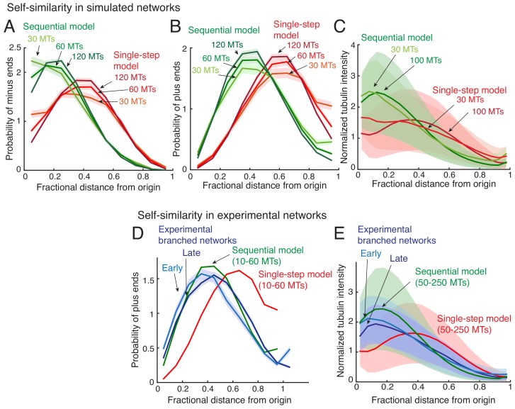 Figure 2—figure supplement 3. Self-similarity in the architecture of branched networks.(A–B) Positions of the minus-ends were recorded in simulated branched networks. The distances of all minus-ends were calculated from the origin, normalized by seed MT’s length, and the resulting probability distribution of was plotted in (A). The distances of all plus-ends were calculated from the origin, normalized by the largest distance (set to 1), and the resulting probability distribution of was plotted in (B). Data was obtained for roughly 250 branched networks containing 30, 60 or 120 MTs. Total number of measurements for single-step model (red): 30 MTs (n = 7535), 60 MTs (n = 14234), 120 MTs (n = 22655), and for sequential model (green): 30 MTs (n = 7602), 60 MTs (n = 15189), 120 MTs (n = 28300). (C) Tubulin intensity in simulated branched networks was measured against distance from the origin, normalized by the longest distance (set to 1). Data for obtained for roughly 250 branched networks each containing 30 or 100 MTs. Shaded regions depict the standard deviation in intensity measurements. (D) Positions of plus-ends were obtained in branched networks. Distances of all plus-ends was calculated from the origin, normalized by the largest distance (set to 1), and the resulting probability distribution of was plotted. For experiments, 17 branched networks generated were imaged over time and their plus-end distribution was measured when each network contained 10–30 EB1 comets (cyan, n = 8624), and 35–55 EB1 comets (blue, n = 17676). For simulated networks, data was pooled for 10–60 MTs in 250 branched networks each simulated using the single-step model (red, n = 633517) and sequential model (green, n = 495794). Shaded regions depict the 95% confidence intervals. The experiments and analyses were repeated with two independent extract preparations and representative experiment was reported. See Figure 2—figure supplement 2 and Materials and methods for measurement procedure. (E) Tubulin intensity in branched networks was plotted against distance from the origin, normalized by the longest distance (set to 1). Snapshots of branched networks were imaged at early time-point (10 min, cyan), and the same networks were imaged again later (14 min, blue). All measurements were pooled for 59 branched networks generated with one Xenopus extract preparation, and the experiments and analyses were repeated with two independent extract preparations. For simulations, data was pooled for 50–250 MTs in roughly 250 branched networks each simulated using the single-step model (red) and sequential model (green). Shaded regions depict the standard deviation in intensity measurements. See Figure 2—figure supplement 2 and Materials and methods for measurement procedure. |