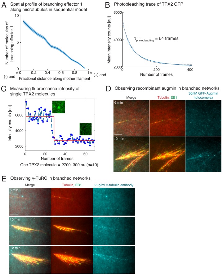 Figure 4—figure supplement 2. Controls for TPX2’s binding rate measurement, and visualization of augmin/γ-TuRC on branched networks.(A) Distribution of branching effector1 in sequential model was measured along the length of mother MT at 100 s. The number of molecules is plotted after rescaling the length of mother MT to 1 (n = 250 measurements). Shaded regions depict the 95% bootstrap confidence interval. (B–C) Fluorescence photobleaching of GFP-TPX2 was performed by attaching TPX2 to untreated glass coverslips. Mean fluorescence in the field of view was plotted over time in (B) and exponential decay curve was fit to obtain the photobleaching time as 64 frames. Because this time scale is significantly longer than the number of frames used to obtain TPX2’s binding rate from intensity versus time traces in Figure 4E, the effect of fluorescence photobleaching was ignored. Photobleaching step of individual TPX2 molecules was observed to obtain the fluorescence count of a single TPX2 molecule at its center pixel. A representative trace is shown in (C, blue circles), and data was fit to Heaviside function (red curve) using MATLAB curve-fit. Fluorescence of single TPX2 molecule was measured as 2700 ± 300 au (n = 10 traces). (D–E) Observation of augmin and γ-TuRC during branched network formation. Recombinant GFP-augmin holocomplex was added at 30 nM to Xenopus egg extracts. Branched MT networks were generated with 10 μM RanQ69L, and time-lapse of augmin on the networks was recorded in (D). MTs are labeled with Cy5-tubulin (red), their plus-ends with EB1 (green), and augmin is displayed in cyan. 0 s marks the start of the reaction. Alexa-647 labelled XenC antibody against γ-TuRC was added to Xenopus egg extracts at 2 μg/ml in (E). Branched MT networks were generated with 10 μM RanQ69L, and time-lapse of γ-TuRC on the networks was recorded. MTs are labeled with Alexa-488 tubulin (pseudo-colored as red), their plus-ends with EB1 (green), and augmin is γ-TuRC in cyan. 0 s marks the start of the reaction. Both augmin and γ-TuRC are not visible on individual MTs, but appear later as more MTs nucleate in the branched networks. Scale bars, 10 μm. The experiments were repeated thrice with independent egg extract preparations. |