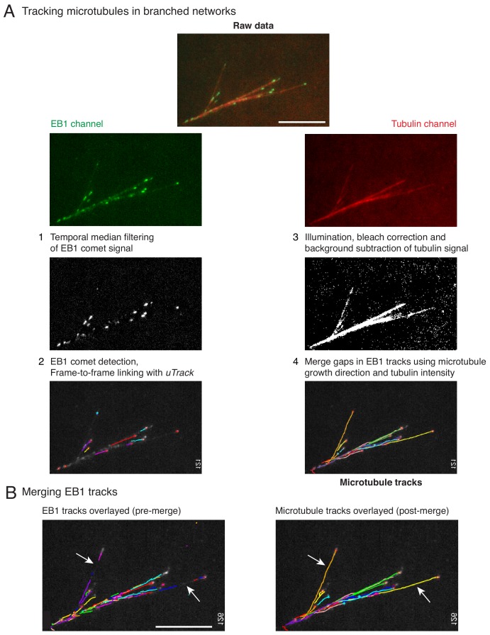 Figure 1—figure supplement 1. Hybrid tracking of branched microtubule networks.(A) Microtubules (MTs) in branched networks were tracked in the following four steps. (1) EB1 comets were pre-processed using temporal median filter, which isolates only moving particles in an image sequence. (2) Processed EB1 signal was supplied as input to comet detection and plus-tip tracking modules of uTrack, and EB1 trajectories were obtained. The EB1 trajectories do not represent the entire MT track due to gaps (white arrows, left panel in (B)), which occur when the MT plus-end undergoes pause or catastrophe. These gaps were closed by software using steps 3 and 4. (3) MT intensity was pre-processed to account for uneven illumination, bleaching and background from soluble tubulin was subtracted. (4) The EB1 gaps were closed by merging multiple EB tracks via a greedy optimization algorithm, which is based on the growth direction of the tracks, distance between the tracks as well as the MT intensity in gaps. Complete MT trajectories in the branched network were obtained (right panel in (B)). Scale bars, 10 μm. See Video 2 for tracking example, Materials and methods for detailed tracking procedure. MATLAB software for tracking is provided in Supplementary file 1 . |