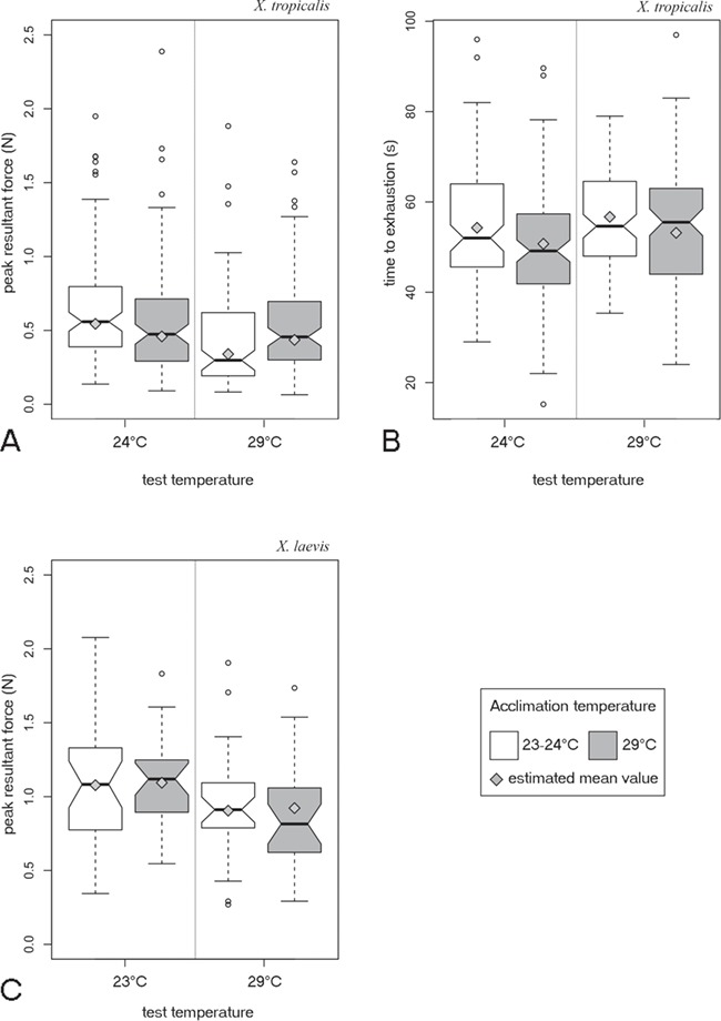 Figure 1. Effects of acclimation temperature and test temperature on the locomotor performance of two frog species. (A) Jumping performance measured as the peak resultant jump force in X. tropicalis (Naccl.24°C test24°C: 101; Naccl. 29°C test 24°C: 98; Naccl. 24°C test 29°C: 99; Naccl. 29°C test 29°C: 102). For jump force, the interaction between acclimation and test temperature was significant. (B) Exertion capacity measured as the time jumped until exhaustion in adult X. tropicalis (Naccl.24°C test24°C: 102; Naccl. 29°C test 24°C: 103; Naccl. 24°C test 29°C: 102; Naccl. 29°C test 29°C: 102), acclimation and test temperature had significant but independent effects. (C) Jumping performance in X. laevis (Naccl.24°C test24°C: 31; Naccl. 29°C test 24°C: 27; Naccl. 24°C test 29°C: 31; Naccl. 29°C test 29°C: 26) showing only an effect of test temperature. Notches illustrate the confidence intervals around the median. Values indicated by the grey diamonds are the estimated mean values from our mixed-effects model.