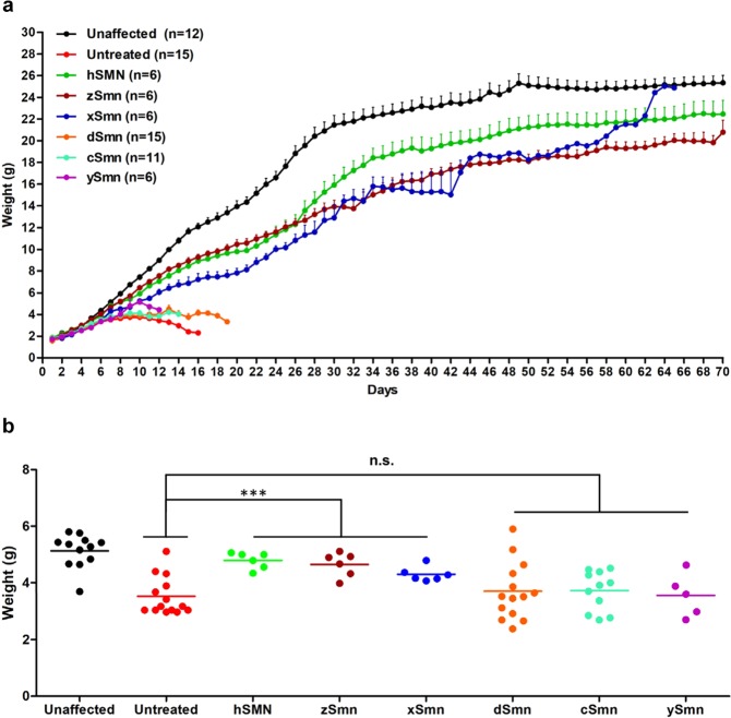 Figure 3. SMN homologs induce healthy weight gain in SMNÎ7 animals. (a) Weight gain curves in grams of SMNÎ7 mice treated with various SMN homologs and control littermates. Error bars indicate SEM. Statistical analyses were performed by Studentâs t-test (of each treatment), where significance was shown with pâ<â0.0001 for untreated vs. hSMN, zSMN and xSMN cohorts; where no significant weight gain difference was observed between untreated and dSMN (pâ=â0.0681), untreated and cSMN (pâ=â0.2813), untreated and ySMN (pâ=â0.2874). (b) Individual body weights from all cohorts on P7. The scatter plot shows two divergent groups of SMN homologs that are distinct at earlier stages of life. |