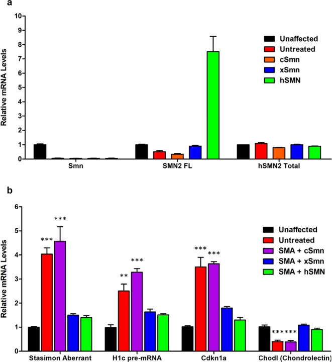 Figure 6. Functional analysis of SMN homologs in RNA processing. Total mRNA levels from mouse spinal cord tissues (nâ=â3) were assayed by RT-qPCR. Relative mRNA levels are normalized and compared to unaffected wild type animals. (a) Levels of total endogenous mouse Smn, full-length (SMN2 FL) and total human SMN transcripts from the SMN2 gene. (b) Analysis of representative SMN-dependent RNA processing events that are dysregulated in SMA mice, which include aberrant U12 splicing of Stasimon mRNA, 3â²-end processing of H1c histone mRNA, accumulation of Cdkn1a mRNA, and decreased Chodl mRNA expression. cSmn is not able to correct mRNA processing defects induced by SMN deficiency in SMA mice (untreated, red), whereas xSmn rescue of these defects was as effective as treatment with full-length human SMN (hSMN). Data represent mean and S.E.M from independent biological replicates. Statistical analysis was carried out by one-way ANOVA and significance is represented by â*âpââ¤â0.05; â**âpââ¤â0.01; â***âpââ¤â0.001. |