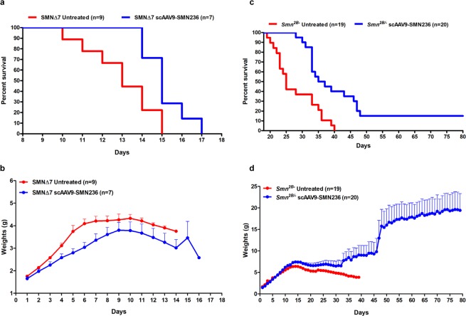 Figure 7. AAV delivery of SMN236 â an artificial protein containing only the most highly evolutionarily conserved domains of human SMN â improves survival and weight gain in SMA mice. SMN homologs demonstrate regions of high conservation in the amino acid sequences encoded by human SMN exons 2a, 2b, 3 and 6. Therefore, the SMN236 construct was designed to contain these regions and incorporated into a viral vector for gene delivery in mouse models of SMA. (a,b) Analysis of SMN236 injected in the severe SMNÎ7 mice on survival (a) and weight gain (b) compared to the age-matched control littermates. The difference in survival between treated (median 15 days) and untreated SMNÎ7 (median 13 days) mice was calculated by the log-rank Mantel-Cox test (pâ=â0.015). (c,d) SMN236 delivered into the intermediate Smn2B/â mouse model of SMA delayed early deaths with median survival 25 days for untreated vs. 36 days for the treated animals (Mantel-Cox test; pâ=â0.00023) (c) and has the greatest weight gain effect in the long-lived animals (d). Data expressed as mean and S.E.M. |
