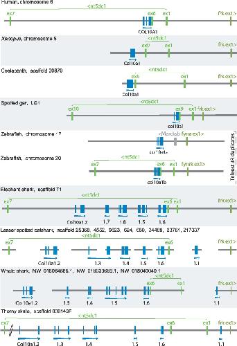 Fig. 1. Conserved synteny between Col10a1 genomic region in osteichthyan species: human, Xenopus, coelacanth, spotted gar, zebrafish; and region containing Col10a1 gene duplicates (numbered .1â.8) in chondrichthyan species: elephant shark, catshark, whale shark, and thorny skate. Genomic data for osteichthyan species were extracted from public databases (Ensembl, NCBI, XenBase) and analyzed to reconstruct the synteny blocks of duplicated Col10a1 genes in chondrichthyans. Distances are to scale within each species but may differ between species. Abbreviation: ex, exon.