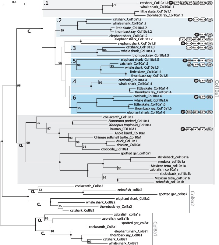 Fig. 2. Maximum likelihood phylogenetic tree based on analysis of Col10a1 nucleotide sequences with GTR+R4+F evolution model in IQ-TREE. Bipartition support was evaluated by 100 bootstrap replicates. Maximum support is shown by filled circles. Bootstrap supports below 75 are not displayed, and the branch thickness of their corresponding bipartition was decreased. Col8a1 and Col8a2 genes were used as outgroups and tree was rooted following Aldea et al. (2013). Predicted protein domains for catshark, elephant shark, and human Col10a1 sequences are displayed next to the gene names. Protein domains are labeled as SPâsignal peptide, GXYâcollagen triple alpha helix repeat, C1qâcomplement component 1q domain, and SEâserine-rich, acidic domain. Abbreviations: C., Chondrichthyes (cartilaginous fishes); O., Osteichthyes (bony fishes).