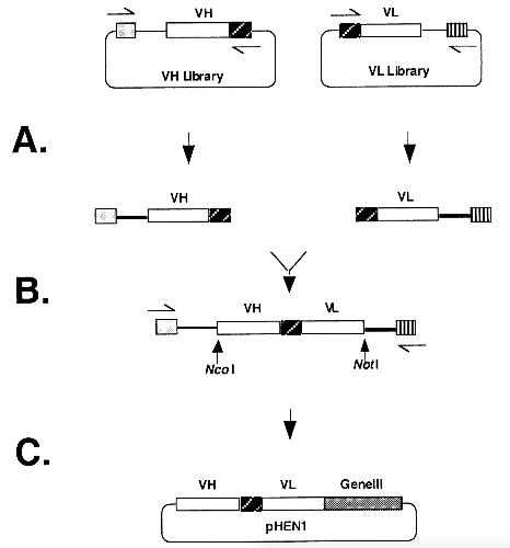 Schematic outline of the approach used for library construction. A library of VH and genes was generated from rearranged human V-genes and cloned into the plasmid pCITE3A. The VL genes used for scFv assembly were derived from a previously constructed scFv library contained in the plasmid pHEN1 (12). The vector containing the VL repertoire also contained the scFv linker DNA 5′ to the VL genes. Primers for reamplification of the V-gene repertoires were derived from sequences several hundred bp 5′ (the VH genes) or 3′ (the VL genes) of the scFv gene cloning sites. This approach facilitated the efficiency of PCR assembling a new scFv repertoire and increasing the efficiency of cutting assembled scFv genes with restriction enzymes. (A) VH and linker-VL gene repertoires were generated by PCR from the plasmid DNA of the separate libraries. The VH genes were amplified by using a plasmid specific primer and an equimolar mixture of HuJH primers . The linker DNA and VL genes were amplified by using a plasmid specific primer and an equimolar mixture of RHuJH primers . The RHuJH primers are complementary to the HuJH primers. (B) The VH and linker DNA-VL gene repertoires were PCR assembled into a scFv gene repertoire. (C) The assembled scFv gene repertoire was cut with the restriction enzymes NcoI and NotI and cloned into the plasmid pHEN1 (17) for phage display.