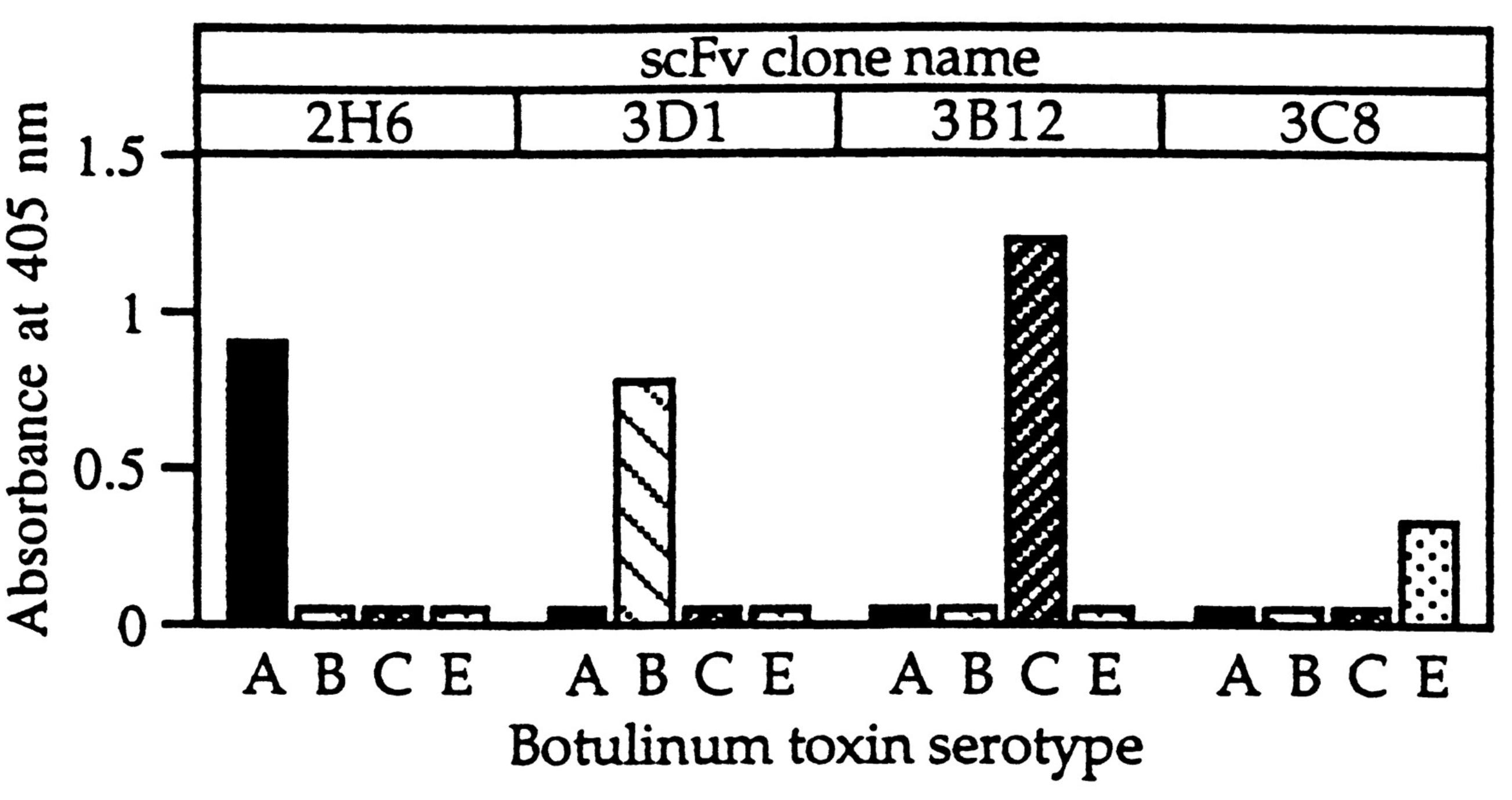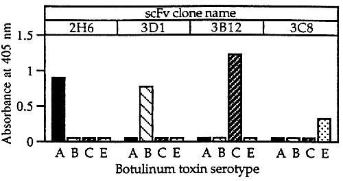 Specificity of anti-Botulinum neurotoxin scFv. Representative scFv (2H6, 3D1, 3B12, and 3C8) isolated respectively from selections on BoNT serotypes A, B, C, and E were studied. Specificity was determined by ELISA.