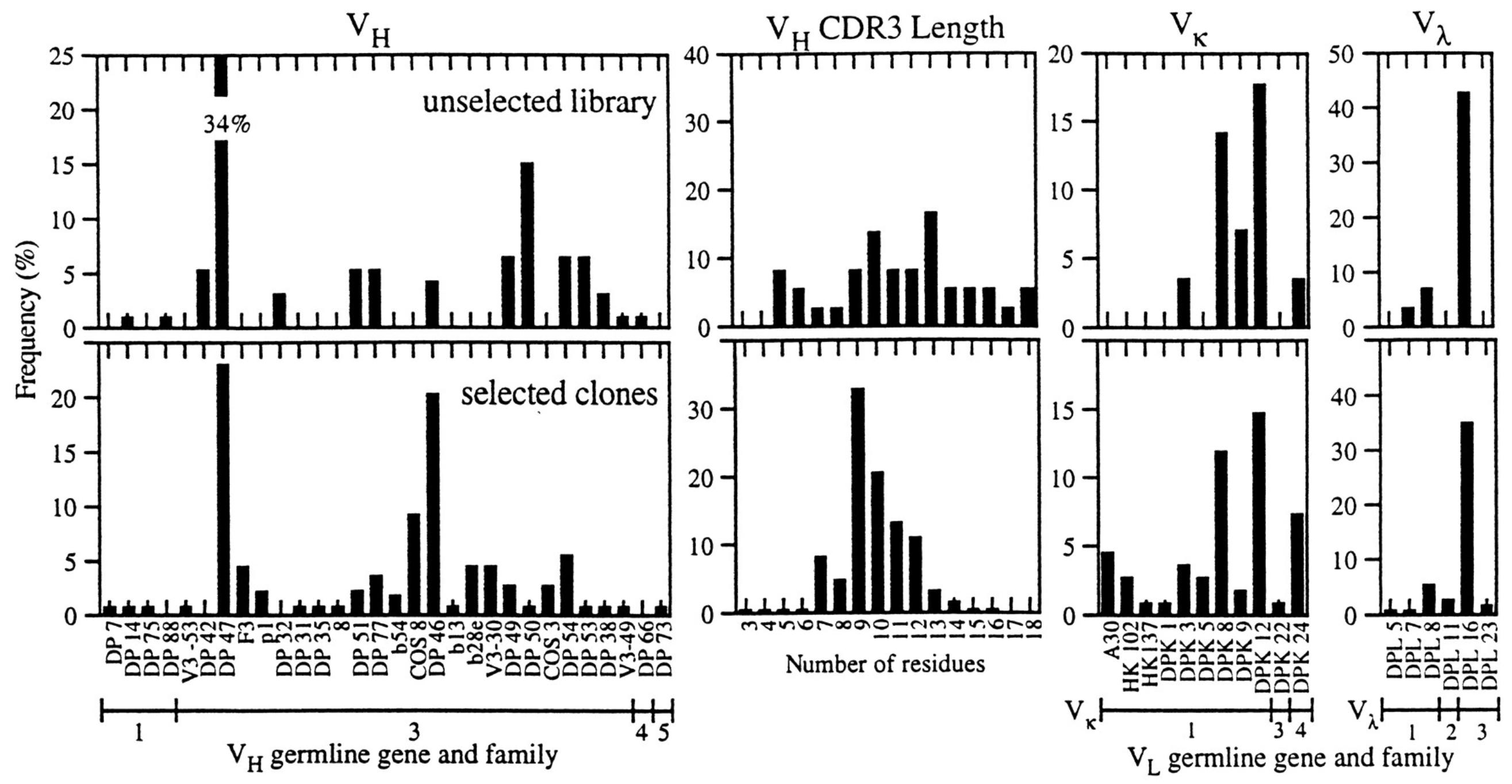 V-gene usage and VH CDR3 length of unselected and antigen-specific scFv. The VH and VL genes were sequenced and the germ-line gene was assigned based on homology to a database (VBASE) of germ-line V-genes compiled by Tomlinson et al. (25). Specific VH, Vκ, and Vλ genes are listed on the ordinate, with the VH, Vκ, or Vλ germ-line gene family indicated below. Only V-genes in unselected or selected clones are listed.