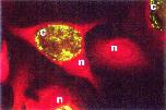 Staining of HeLa cells infected with C. trachomatis with the scFv 2A10. The scFv specifically stains C. trachomatis elementary bodies (c) within infected HeLa cells but does not stain uninfected cells. n = nucleus.