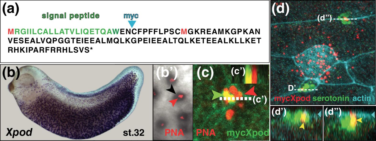 Mucus secretion and ciliary motility are hallmarks for muco-ciliary epithelia (MCE). Both, mammalian airways as well as the less complex epidermis of Xenopus embryos show cilia-driven mucus flow to protect the organism against harmful effects by exogenous pathogens or pollutants. Four cell types set up the epidermal MCE in Xenopus. Multi-ciliated cells (MCCs) generate an anterior to posterior flow of mucus. Ion secreting cells (ISCs) are characterized by the expression of ion transporters, presumably to maintain a favorable homeostasis. The largest cell type is represented by goblet cells, which cover most of the epidermis and exhibit secretory properties. Additionally, small secretory cells (SSCs) release mucus, antibiotic compounds, and the monoamine serotonin (5-hydroxytryptamine; 5-HT). We have recently shown that serotonin regulates flow velocity by acting on ciliary beat frequency. Here, we describe the identification and functional characterization of Xenopus polka-dots (Xpod). No homologous genes or proteins were found in other vertebrates, including Xenopus tropicalis. We demonstrate that Xpod serves as an SSC-specific marker, starting to be expressed shortly after SSC specification at neurula stages. Overexpression of a tagged Xpod protein resulted in the localization of secretory granules. Notch signaling induced SSC cell fate, in contrast to its repressing effect on MCC and ISC specification. Xpod loss-of-function revealed that mucus and 5-HT release by SSCs was severely diminished, which impaired the ciliary beating of MCCs. In summary, Xpod specifically marked SSCs and was required for muco-ciliary secretion in Xenopus laevis.