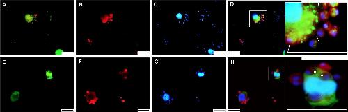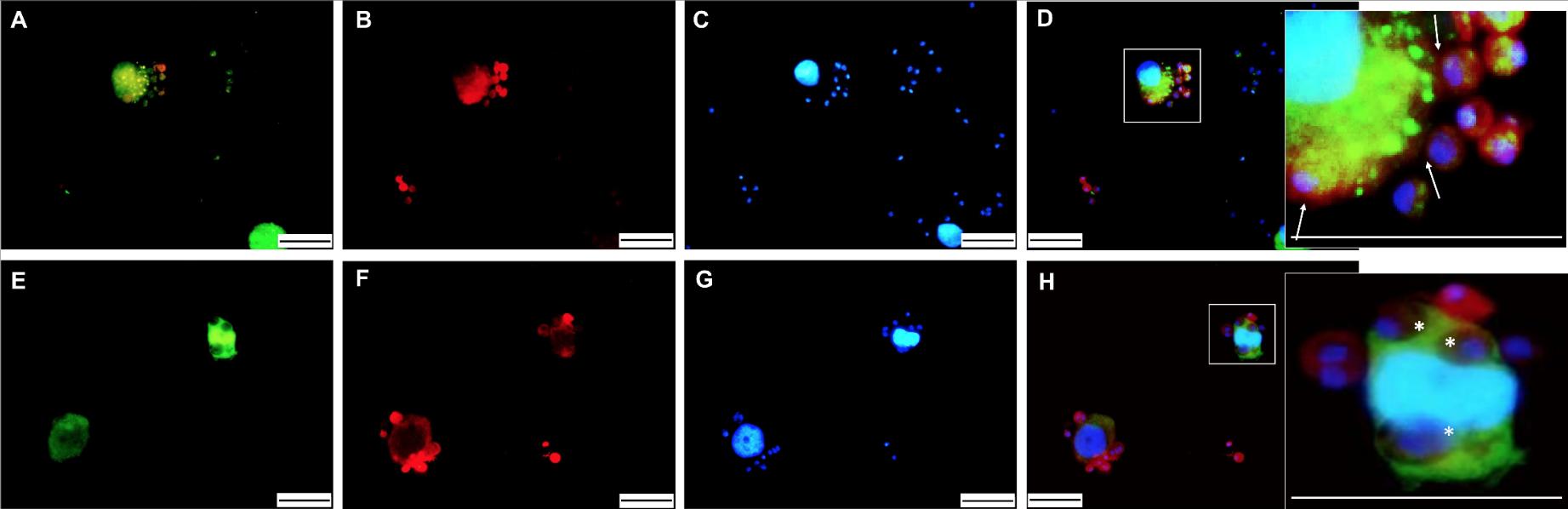 (A, E) Host cells and (B, F) Bd spores were visualised using a green and red cell tracker, respectively. (C, G) Nuclear content was stained with Hoechst and all pictures were merged in (D, H). (A-D) After 4 hours, initial contact was observed between host cells and Bd spores, as indicated by a white arrow (D). (E-H) 24 hours after inoculation, marked intracellular colonization was seen in Litoria caerulea host cells, as indicated by a white asterisk (H). Scale bar = 20 μm.