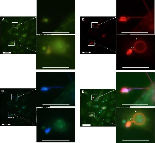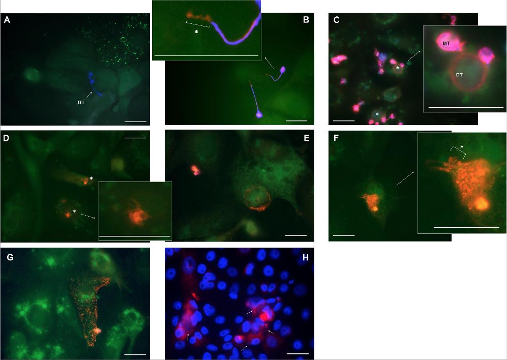 (A) Bd-exposed A6 cells were stained using a green cell tracker. (B) Bd was visualized using Alexa Fluor 568, resulting in red fluorescence of both intracellular and extracellular Bd. (C) The cell wall of extracellular Bd was coloured using Calcofluor White, showing blue fluorescence. The pictures were merged in (D). Two days after inoculation, both epibiotic and endobiotic growth were observed. Epibiotic growth can be described as development outside the host cell (squares with a full line), which stains Bd both blue and red. Endobiotic growth (squares with a dashed line) is visualized as a red staining of the intracellular chytrid thalli (*) at the end of the germ tube (GT). Scale bar = 20 μm.