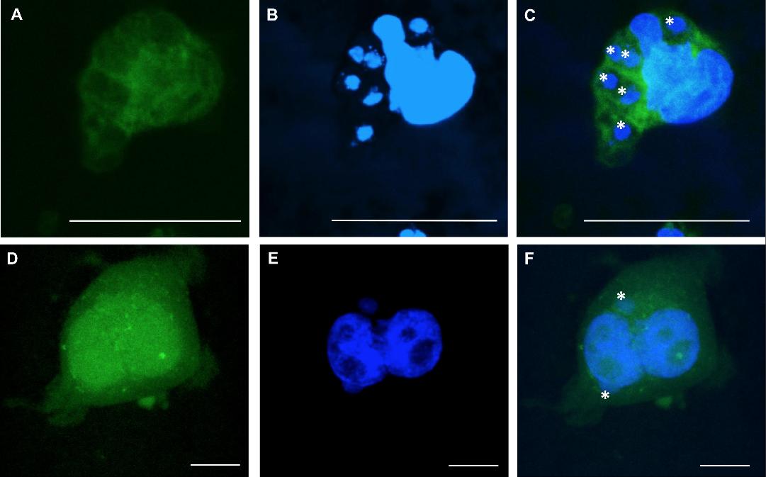 Invasion of Bd inside (A-C) PAK of Litoria caerulea and (D-F) continuous A6 cells of Xenopus laevis was analyzed using confocal microscopy. (A, D) Host cells were stained with a green cell tracker and (B, E) nuclear content was stained with Hoechst. Both stainings were merged in (C, F). By scanning different layers within the cell via confocal microscopy, Bd spores were validated being intracellular, as indicated by a white asterisk. Scale bar = 20 μm.