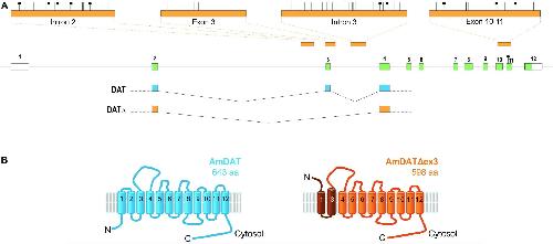Figure 1. The honey bee dopamine transporter (AmDAT). (A) amdat gene model showing the exon and intron junctions of the full-length transcript and its spliced variant, the positions of methylated CpGs (black lollipops), and the regions of four amplicons (top) used for methylation analysis (see the main text and Supplementary Material for more details). The only methylated CpG uncovered by whole-genome methylomics is in exon 11. Protein coding exons are shown in green. (B) The predicted topologies of AmDAT (643 residues; shown in blue) and its splice variant AmDATΔex3 (598 residues; shown in orange). AmDATΔex3 lacks transmembrane domain 2 (TMD2) as well as the following cytosolic loop, resulting in an elongated TMD3. The affected region is shaded dark orange. The orientation of the N-terminus and TMD1 are predicted by TMpred and SPOCTOPUS to be inverted relative to the full-length protein. |
