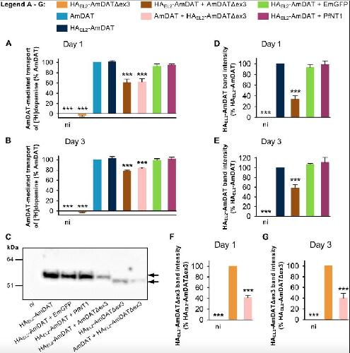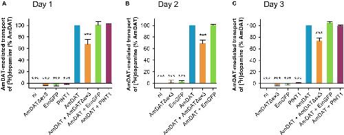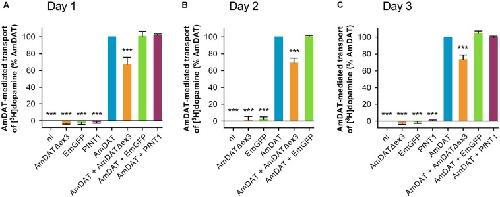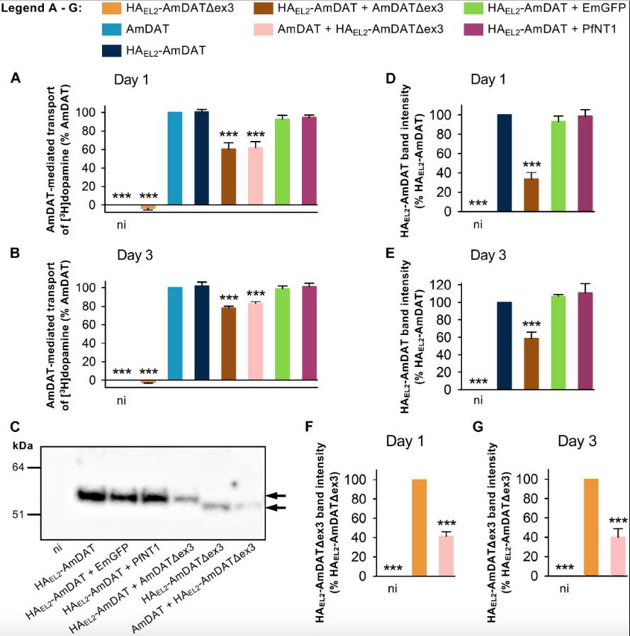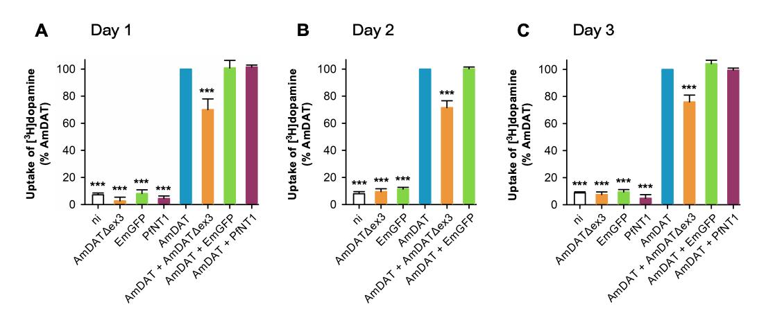 Figure 4. AmDATÎex3 downregulates the AmDAT-mediated uptake of dopamine in Xenopus oocytes. Measurements of [3H]dopamine transport were performed on (A) day 1, (B) day 2, and (C) day 3 post-cRNA-injection. Non-injected oocytes (ni) were included as a negative control, EmGFP and PfNT1 were included as co-injection controls, and oocytes expressing AmDAT served as the positive control. Dopamine uptake was expressed as a percentage of that measured in the AmDAT-expressing oocytes. The component of [3H]dopamine transport attributable to AmDAT was calculated by subtracting the background level of accumulation (i.e., dopamine uptake in non-injected oocytes) from that measured for each of the other oocyte types (the total levels of [3H]dopamine uptake are presented in Supplementary Figure S4). In all panels, the data are the mean + SEM of 3â10 independent experiments (performed using oocytes from different frogs), within which measurements were made from 10 oocytes per treatment. âââ denotes a significant difference (p < 0.001) from the positive control (one-way ANOVA). |
