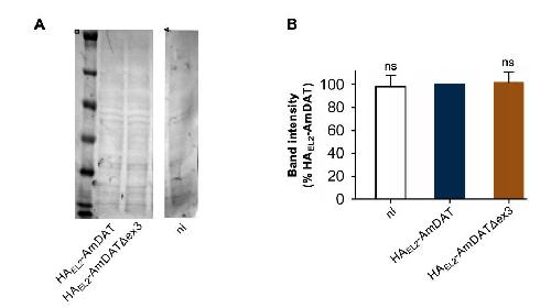 Supplementary Figure 2. Total protein levels in the western blot analyses of oocytes expressing HAEL2-AmDAT or HAEL2-AmDATÎex3. (A) A representative image depicting the total protein present in samples prepared from oocytes expressing HAEL2-AmDAT or HAEL2-AmDATÎex3. Non-injected oocytes (ni) were included as a negative control. Preparations of oocyte membrane proteins were separated on a SDS-polyacrylamide gel and transferred to a nitrocellulose membrane. The proteins were visualised with the MemCodeTM reversible protein stain kit and the image is representative of n = 6. (B) The amount of protein present in each lane was semi-quantified using Image Studio Lite and the resulting values were expressed as a percentage of that measured for the HAEL2-AmDAT lane. Total protein levels are shown as the mean + SEM from 6 independent experiments performed on day 3 post-cRNA-injection. ns, no significant difference (p > 0.05) from the HAEL2-AmDAT lane (one-way ANOVAs). |
