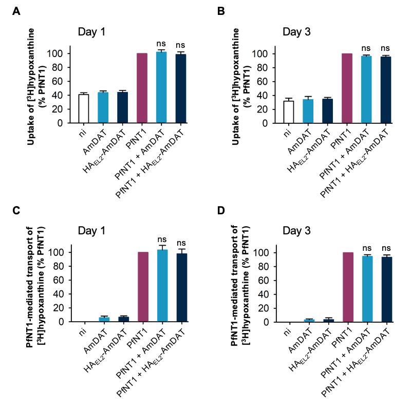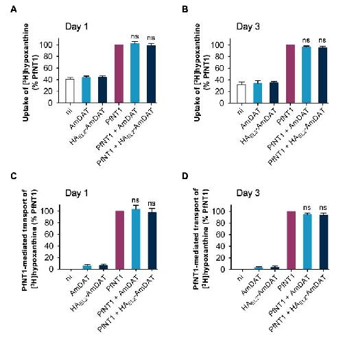Supplementary Figure 5. The uptake of hypoxanthine into Xenopus oocytes co-expressing PfNT1 with AmDAT or HAEL2-AmDAT. (A,B) Measurements of [3H]hypoxanthine transport were performed on days 1 and 3 post-cRNA-injection. Non-injected oocytes (ni) were included as a negative control, and oocytes expressing PfNT1 served as the positive control. Hypoxanthine uptake was expressed as a percentage of that measured in PfNT1-expressing oocytes. The rates of hypoxanthine uptake (pmol per oocyte/h) in non-injected oocytes and oocytes expressing PfNT1 were 1.01 ± 0.17 and 2.45 ± 0.34 (day 1), and 1.43 ± 0.40 and 4.30 ± 0.60 (day 3), respectively. (C,D) Using the data shown in panels (A,B), the component of [3H]hypoxanthine transport attributable to PfNT1 was calculated by subtracting the background level of accumulation (i.e. the uptake measured in non-injected oocytes) from that measured for each of the oocyte types. In both panels, the data are the mean + SEM of 3â4 independent experiments (performed using oocytes from different frogs), within which measurements were made from 10 oocytes per treatment. ns, no significant difference (p > 0.05) in hypoxanthine accumulation relative to the PfNT1-expressing oocytes (one-way ANOVAs). |