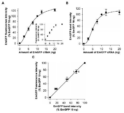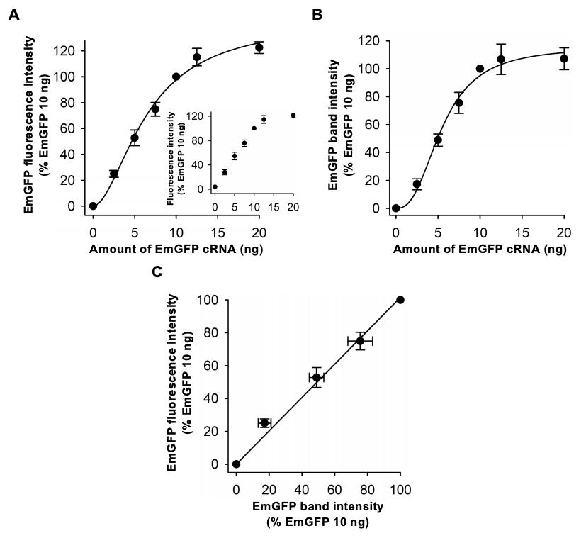 Supplementary Figure 6. Semi-quantification of EmGFP expression in Xenopus oocytes. (A) Oocytes injected with 0â20 ng of EmGFP cRNA were lysed and the total fluorescence intensity (inset plot) measured using excitation and emission wavelengths of 487 nm and 509 nm, respectively. The component of fluorescence attributable to EmGFP (main plot) was calculated by subtracting the background level of fluorescence (i.e. the autofluorescence detected in lysates of non-injected oocytes) from that measured in lysates of oocytes expressing EmGFP. In both plots of (A), fluorescence was expressed as a percentage of that measured for the 10 ng treatment. The resulting plots revealed a sigmoidal relationship between the amount of EmGFP cRNA injected and the fluorescence intensity measured in the oocyte lysates (fourparameter logistic equation; R2 = 0.992). (B) In experiments performed pairwise with those presented in panel (A), the correlation between the amount of EmGFP cRNA injected and the resulting level of EmGFP expression was examined with a western blot protocol (Marchetti et al., 2015). Oocytes were injected with 0â20 ng of cRNA encoding EmGFP and whole oocyte extracts were prepared on day 3 post-cRNAinjection for analysis by western blot (using an anti-GFP antibody). The intensities of the resulting EmGFP bands were expressed as a percentage of that measured for the 10 ng treatment. Plotting these values against the amount of EmGFP cRNA injected revealed a sigmoidal relationship between the amount of EmGFP cRNA injected and the intensity of the EmGFP band (four-parameter logistic equation; R2 = 0.992). The relationship remained approximately linear when ⤠10 ng of EmGFP cRNA was injected into the oocytes. The relationship remained approximately linear when ⤠10 ng of EmGFP cRNA was injected into the oocytes. (C) Combining plots (A,B) over the 0â10 ng treatments confirmed a positive correlation (R2 = 0.989) between EmGFP band intensity and EmGFP fluorescence intensity. Taken together, these datasets indicated that measurements of EmGFP fluorescence intensity can be used to quantify EmGFP protein expression in the lysates of oocytes injected with ⤠10 ng of EmGFP cRNA. In all panels, the data are the mean ± SEM of 3â5 independent experiments (performed using oocytes from different frogs) and were undertaken on day 3 post-cRNA-injection. |