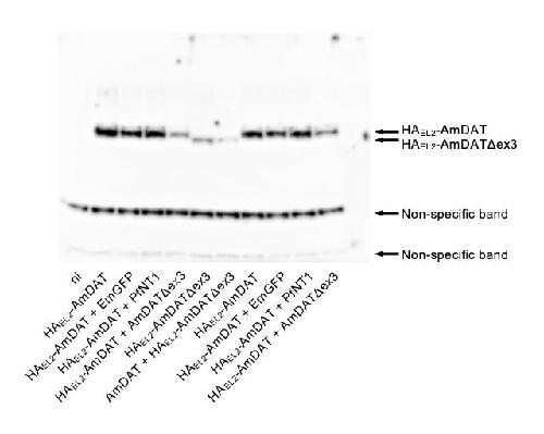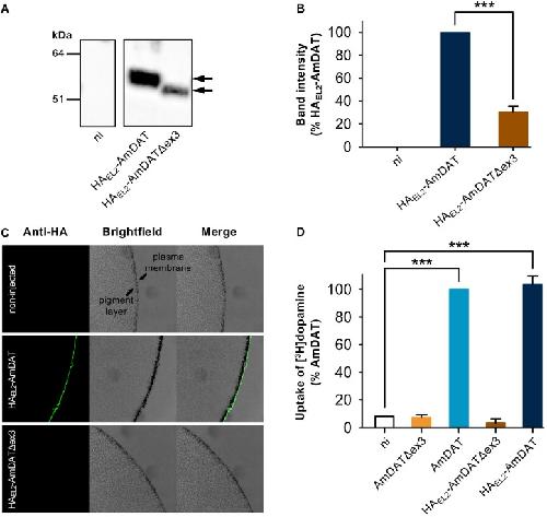 Supplementary Figure 8. Detection of the HAEL2-AmDAT and HAEL2-AmDATÎex3 proteins in oocyte membrane preparations. A cropped version of this figure is presented in Figure 5C. The samples were separated on a SDS-polyacrylamide gel and probed with a mouse anti-HA antibody. Bands corresponding to the predicted sizes of AmDAT and AmDATÎex3 were detected in samples prepared from oocytes expressing HAEL2-AmDAT or HAEL2-AmDATÎex3, respectively, and were absent from the samples prepared from non-injected (ni) oocytes. Two protein bands appeared in the lower half of the western blot image; the presence of these bands in all oocyte samples indicates they are endogenous oocyte proteins that reacted non-specifically with the primary or secondary antibody. The image is representative of > 3 independent experiments (performed using oocytes from different frogs). |