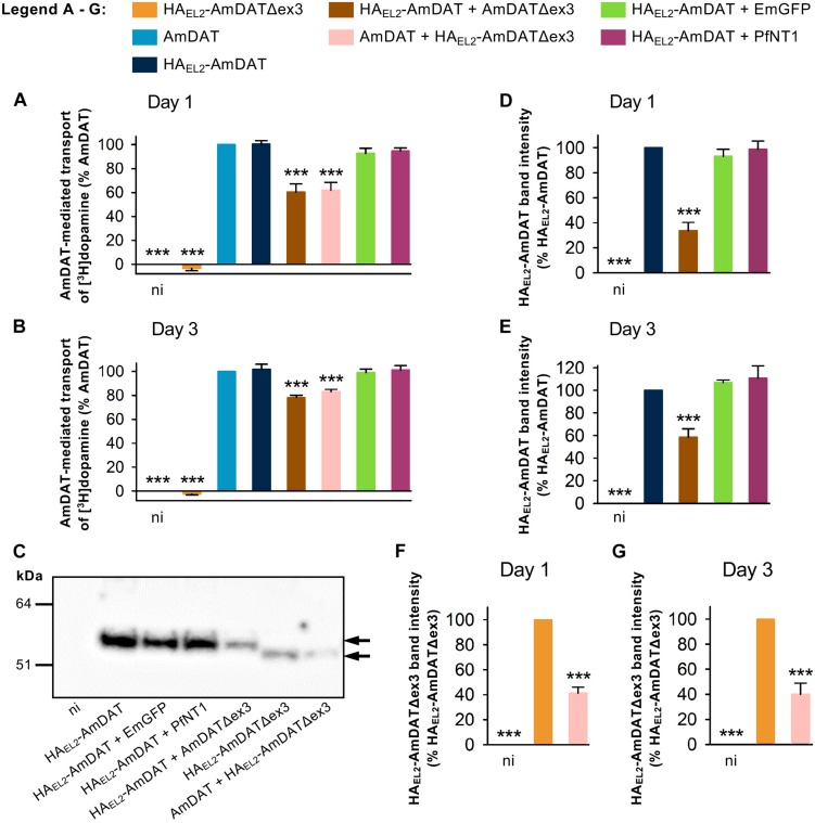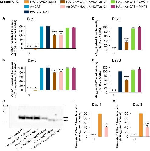 Figure 5. AmDATÎex3 downregulates AmDAT protein levels in Xenopus oocytes. The AmDAT-mediated transport of [3H]dopamine in oocytes expressing the HA-tagged forms of AmDAT or AmDATÎex3 was measured on (A) day 1 and (B) day 3 post-cRNA-injection. Non-injected oocytes (ni) were included as a negative control, EmGFP and PfNT1 were included as co-injection controls, and oocytes expressing AmDAT served as the positive control. Dopamine uptake was expressed as a percentage of that measured in the AmDAT-expressing oocytes. In both panels, the data are the mean + SEM of 3â6 independent experiments (performed using oocytes from different frogs), within which measurements were made from 10 oocytes per treatment. The capacity of HAEL2-AmDAT for dopamine transport, and the ability of HAEL2-AmDATÎex3 to downregulate AmDAT, did not differ significantly from that of its non-tagged counterpart (p > 0.05), consistent with the HA-tag exerting little or no effect upon the functions of these proteins. (C) Detection of the HAEL2-AmDAT (â¼55 kDa band indicated by black arrow) and HAEL2-AmDATÎex3 (â¼50 kDa band indicated by black arrow) proteins in oocyte membrane preparations. These western blot analyses were performed pairwise with the transport assays presented in panel (A). The samples were separated on a SDS-polyacrylamide gel and probed with a mouse anti-HA antibody. The image is representative of >3 independent experiments (performed using oocytes from different frogs) and is shown in full in Supplementary Figure S8. Semi-quantification of the (D,E) HAEL2-AmDAT and (F,G) HAEL2-AmDATÎex3 proteins in the oocyte membrane preparations was performed on day 1 panels (D,F) and day 3 panels (E,G) post-cRNA-injection. Protein band intensities were expressed as a percentage of that measured for the relevant positive control (i.e., oocytes expressing either HAEL2-AmDAT or HAEL2-AmDATÎex3). The data in panels (DâG) are shown as the mean + SEM from 3â8 independent experiments. âââ denotes a significant difference (p < 0.001) from the relevant positive control (one-way ANOVAs). |